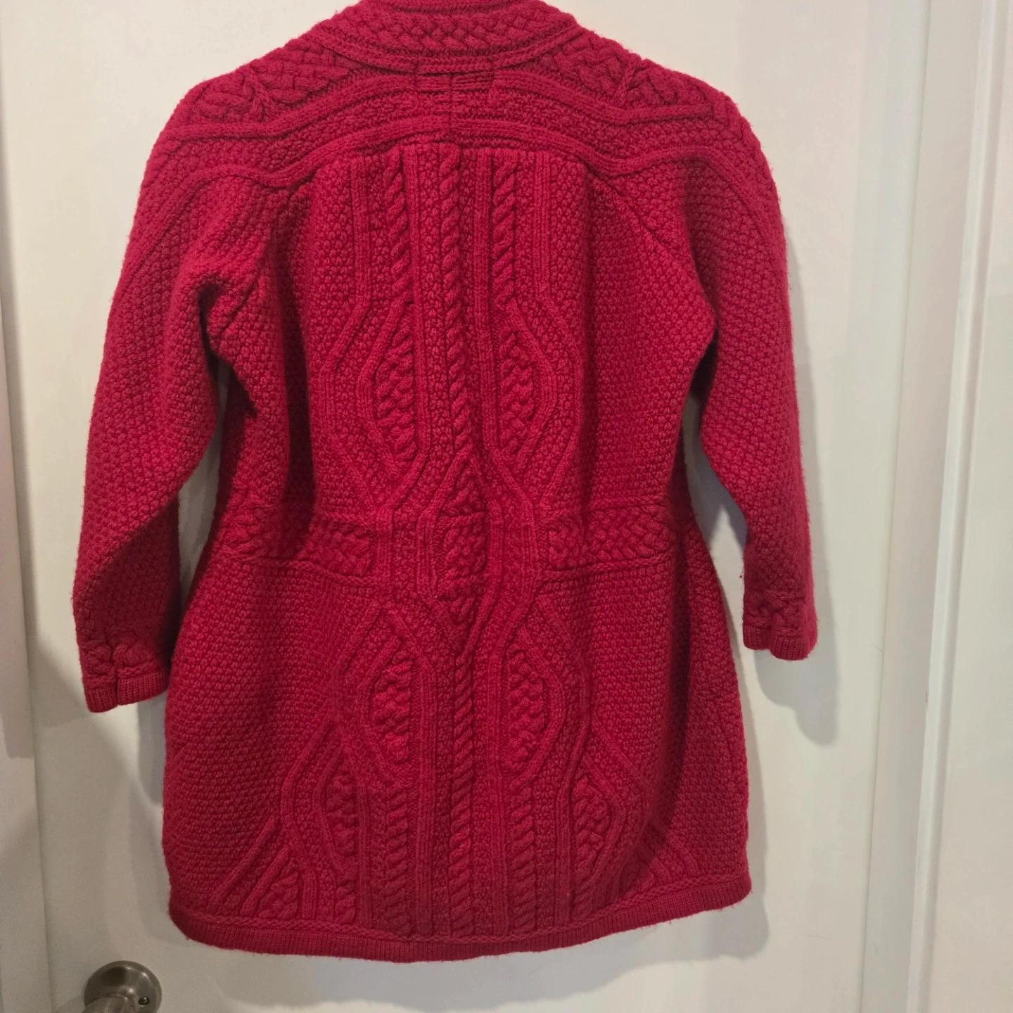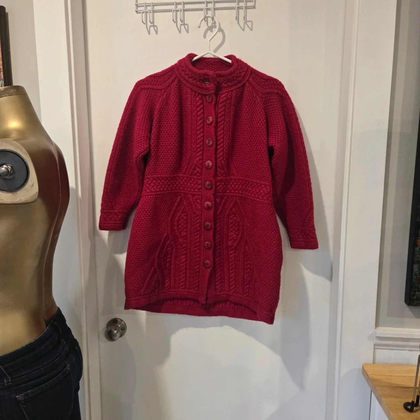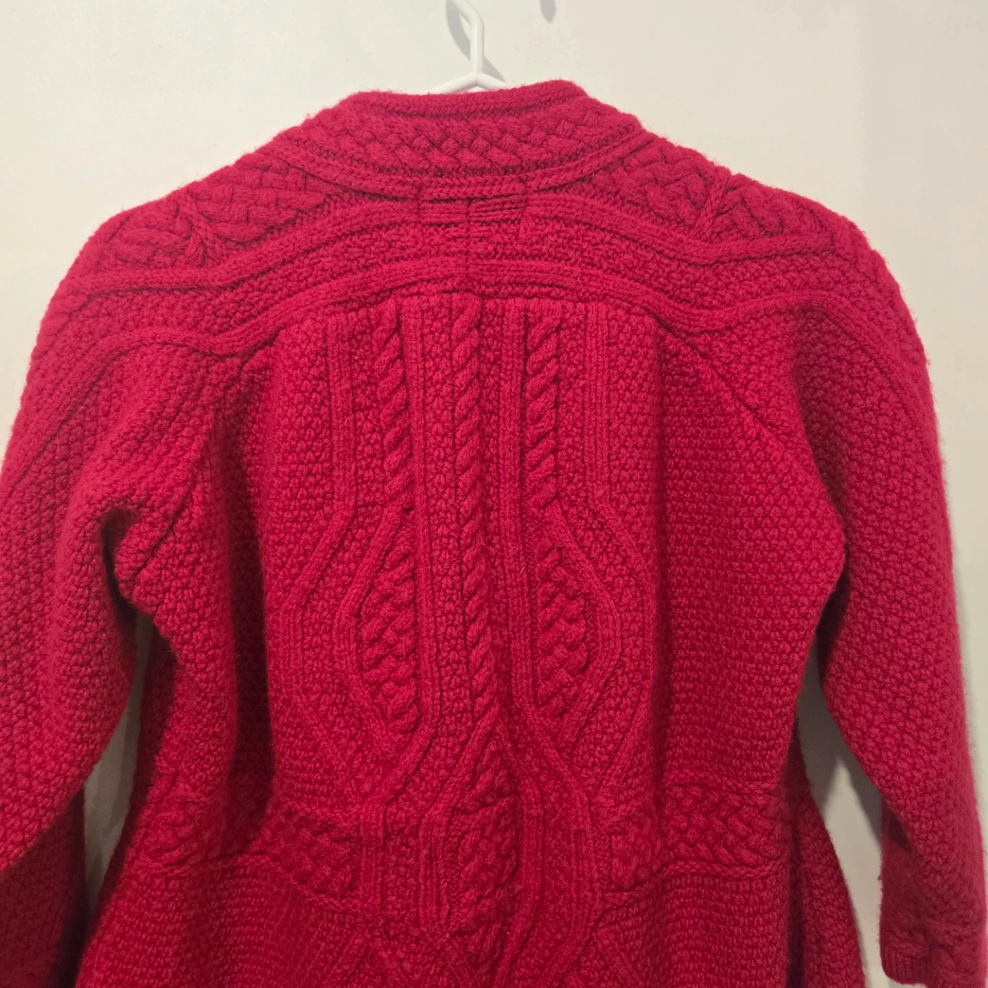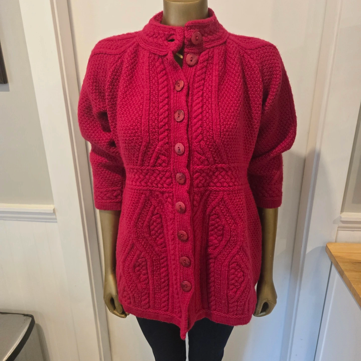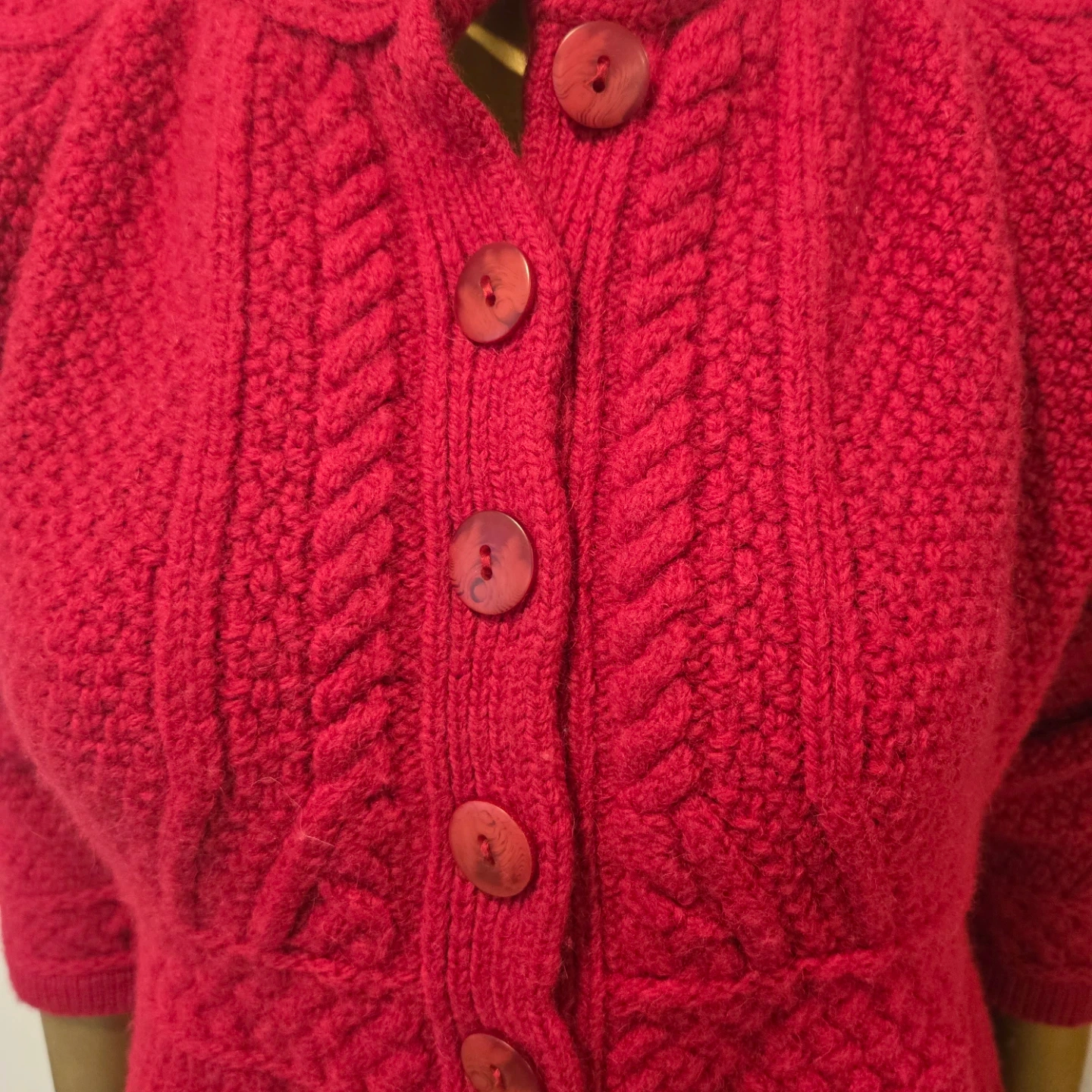 Here’s a beautiful Aran Crafts cardigan made in Ireland! It's a lovely shade of red and made from 100% merino wool. Perfect for staying cozy!