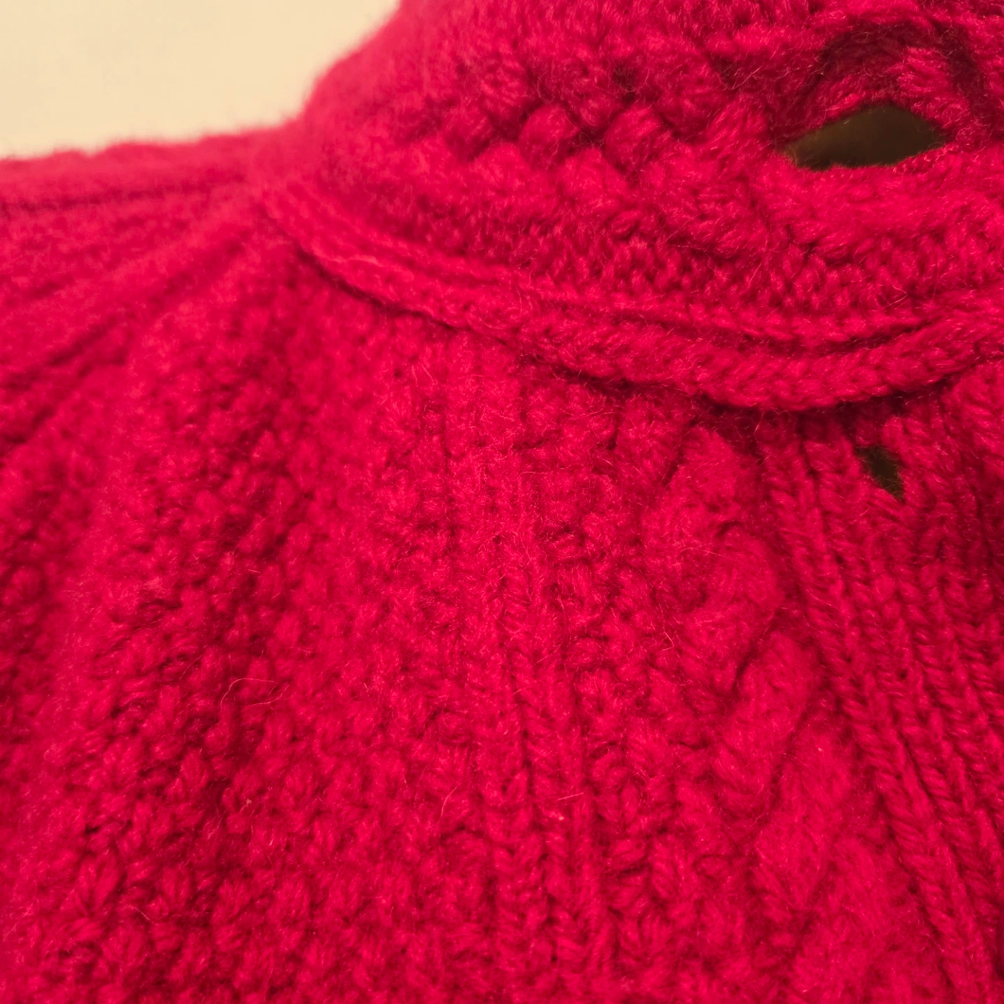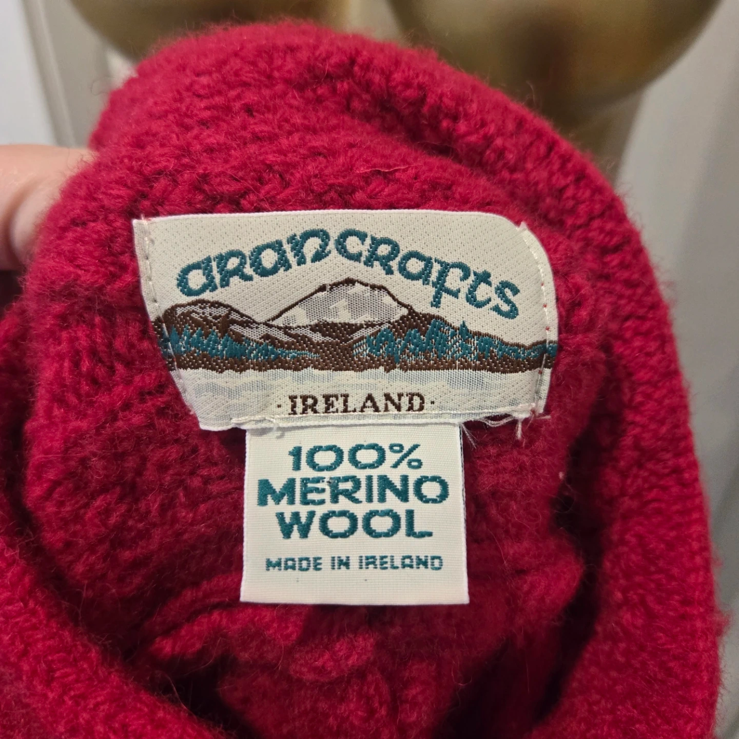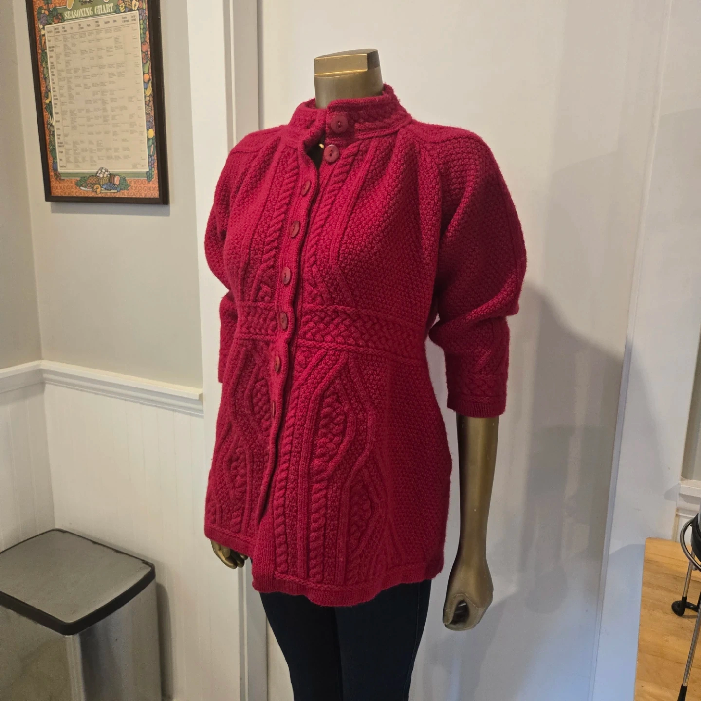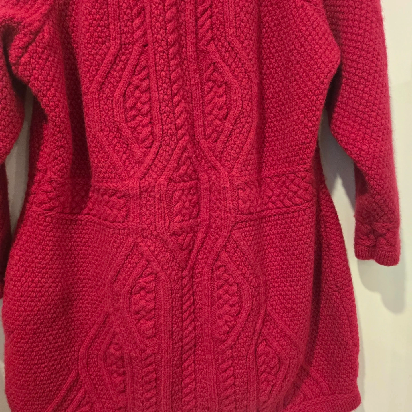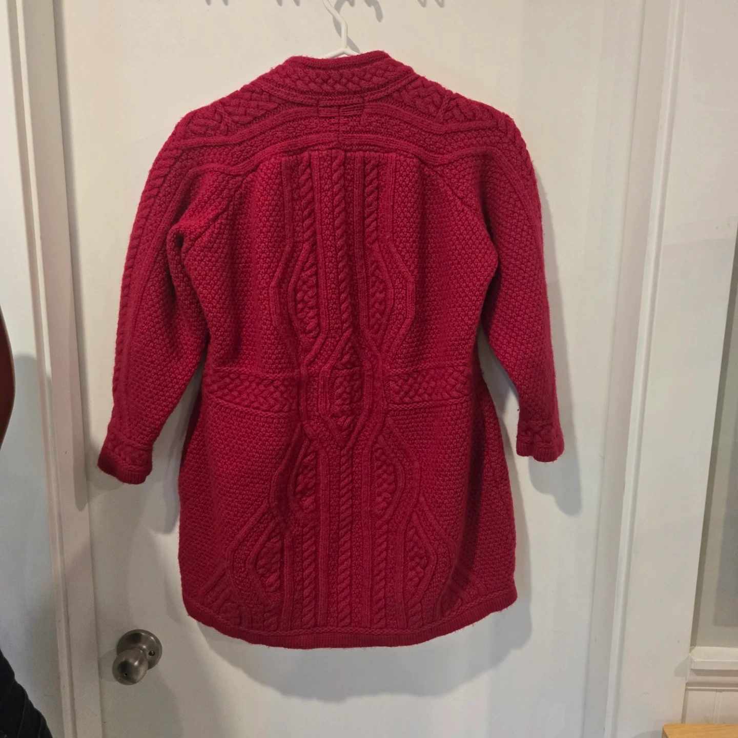 Here’s a beautiful Aran Crafts cardigan made in Ireland! It's a lovely shade of red and made from 100% merino wool. Perfect for staying cozy!