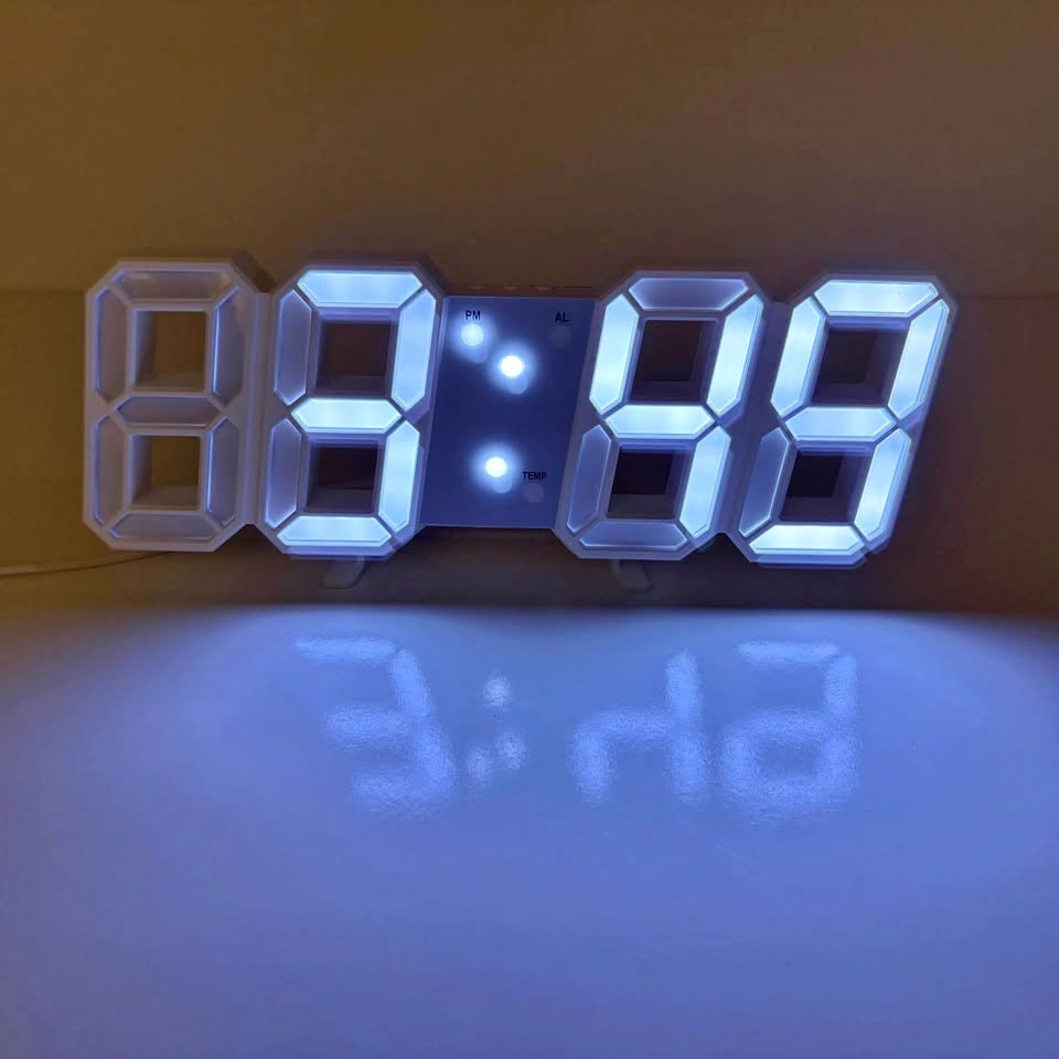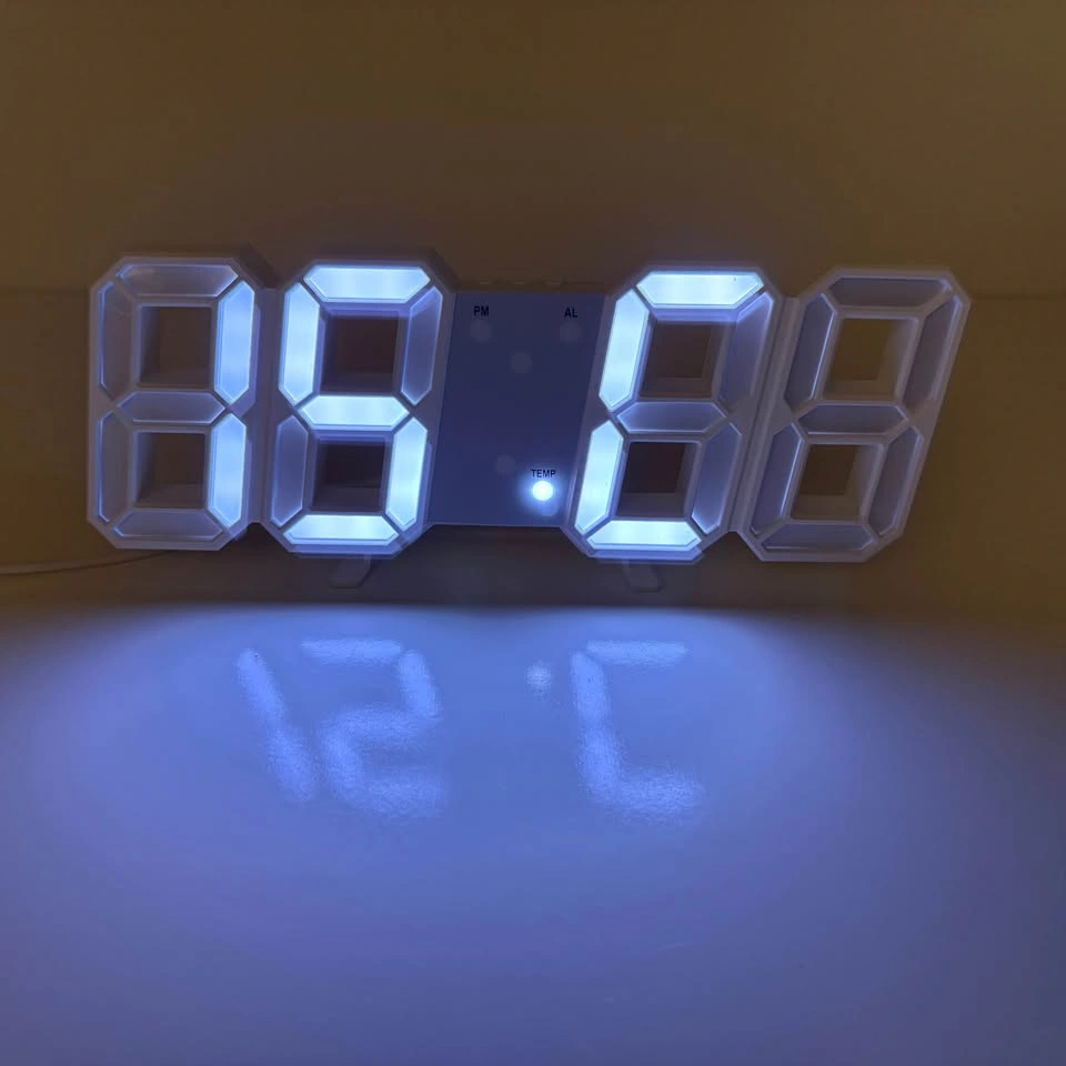 White with white light up digits. Approximately 9”x3.5” Shows time / date / temperature. Modes can be changed if you only want time displayed. Temperature can show °C or °F Can be used with removable stand or mounted to wall. Plugs in to any USB port for power.