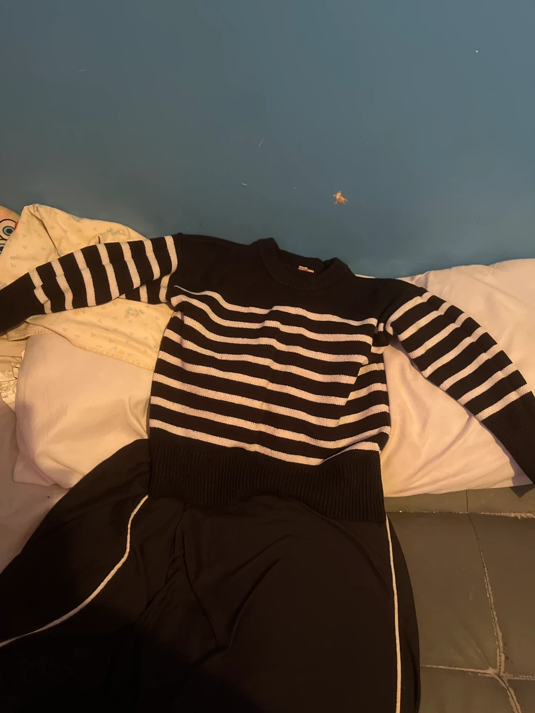 Selling a black and white striped sweater. It's in great condition and ready for a new home! The material feels soft and comfortable, perfect for cooler weather