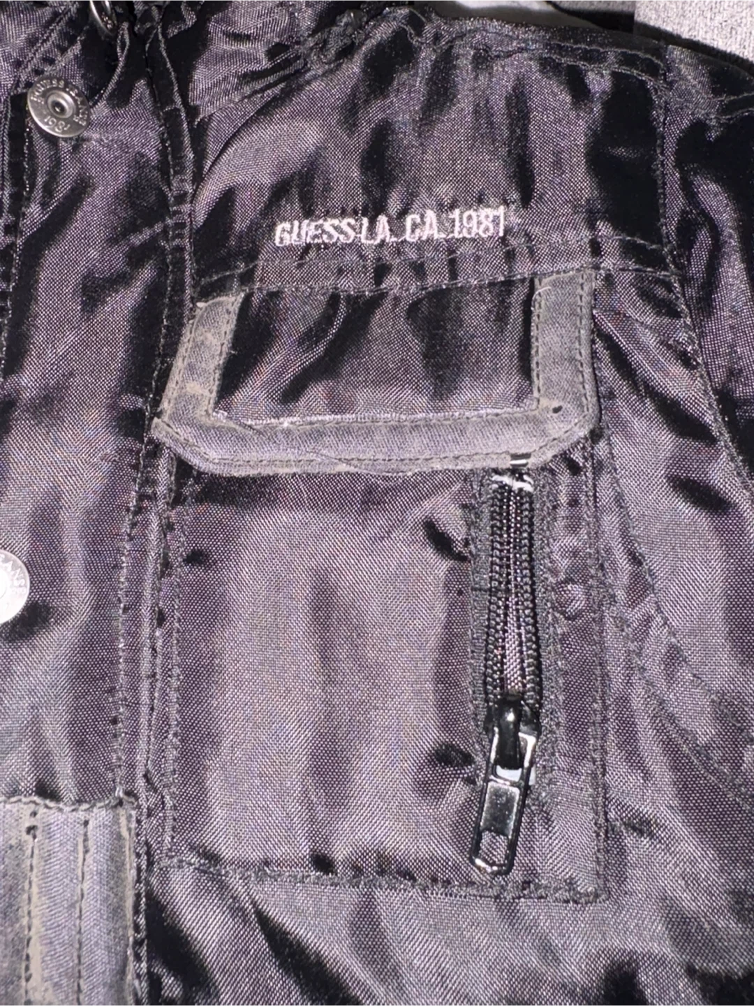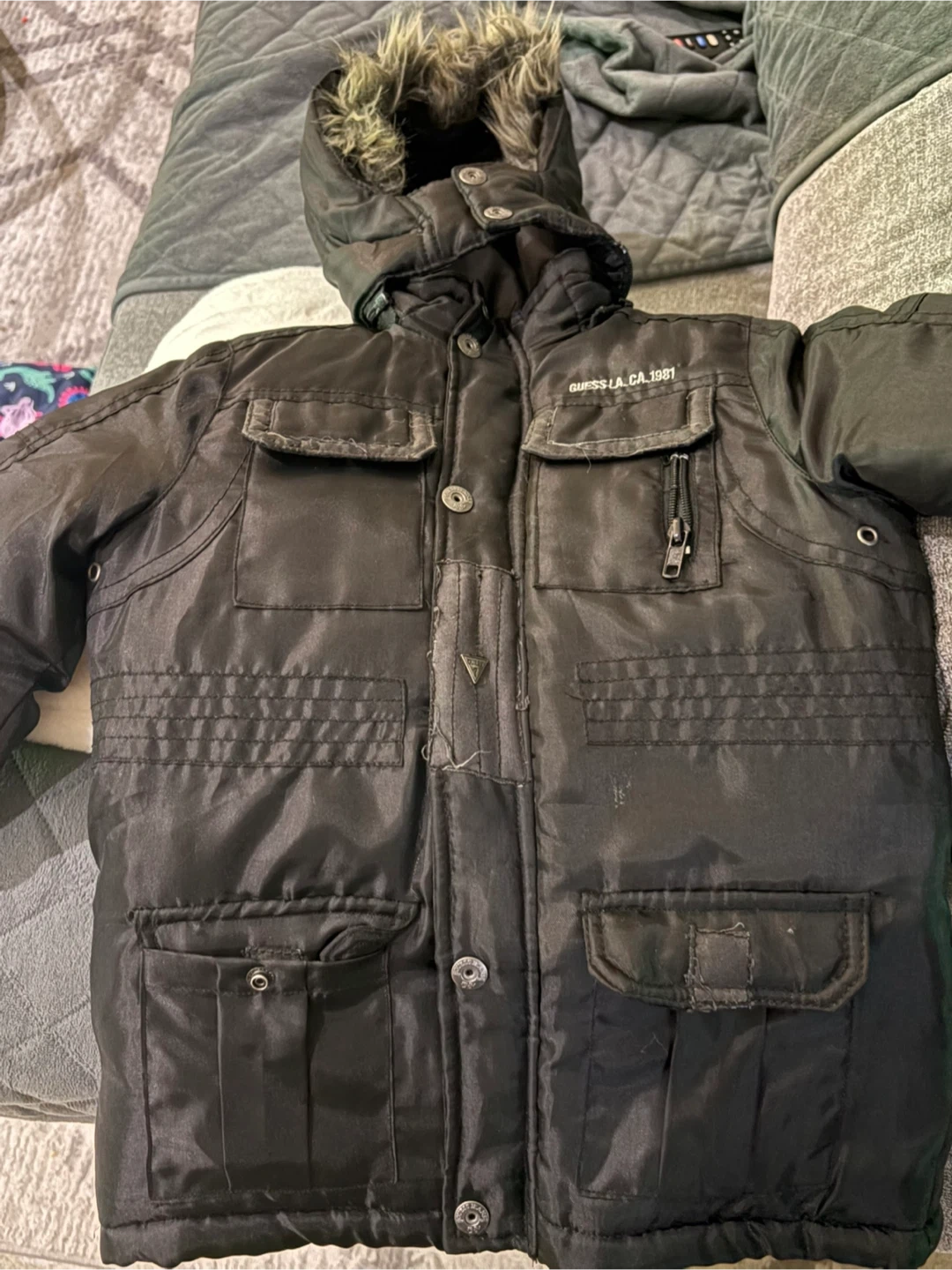 Selling a Guess kids winter jacket in size 4T. It's black and has a faux fur hood. The outer shell is 100% polyester, and the lining is also polyester. It's a great jacket for keeping your little one warm this winter!