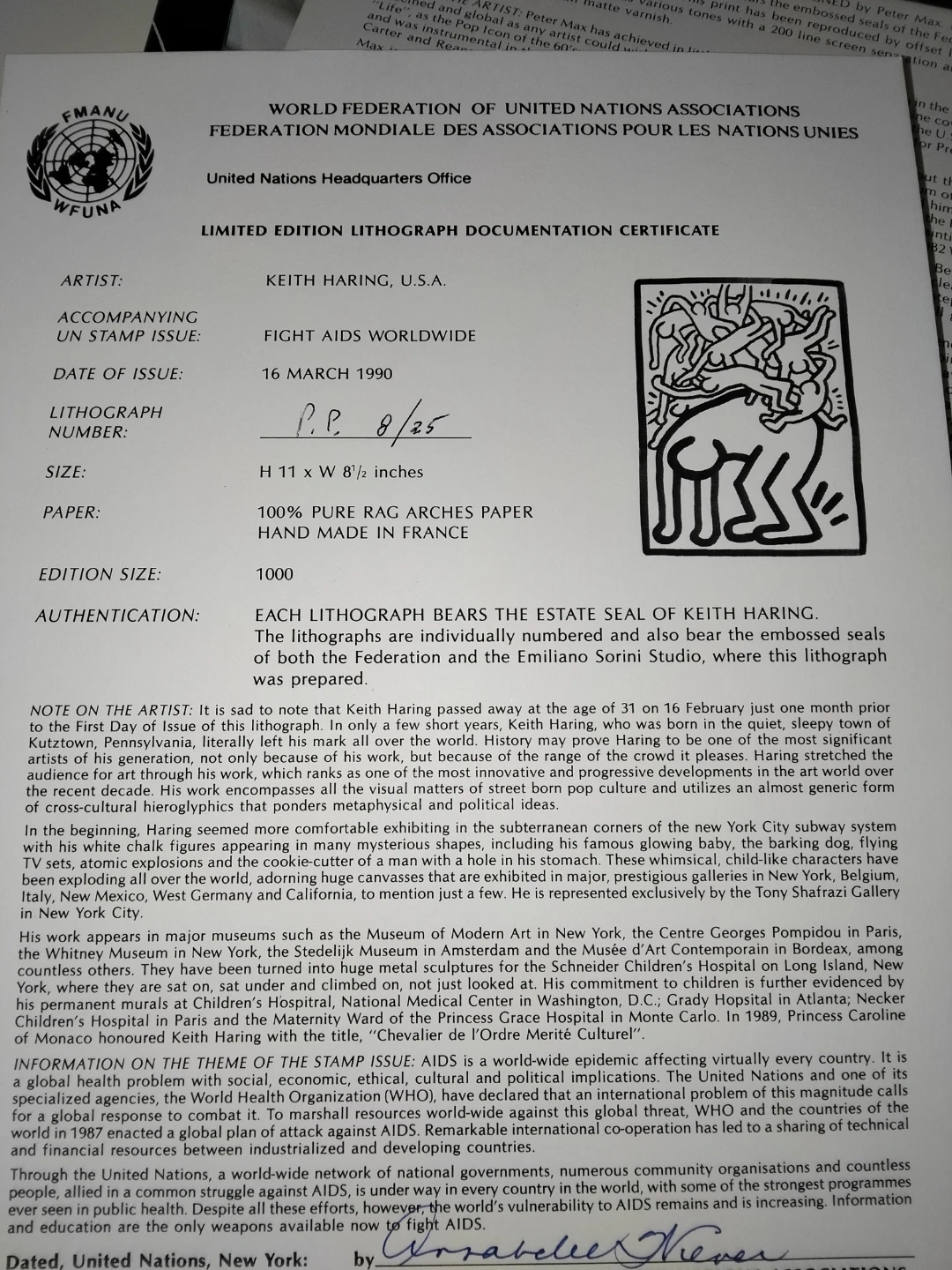 It's from a drawing by Keith Haring, U.S.A. and comes with a certificate of authenticity from The Keith Haring Estate.