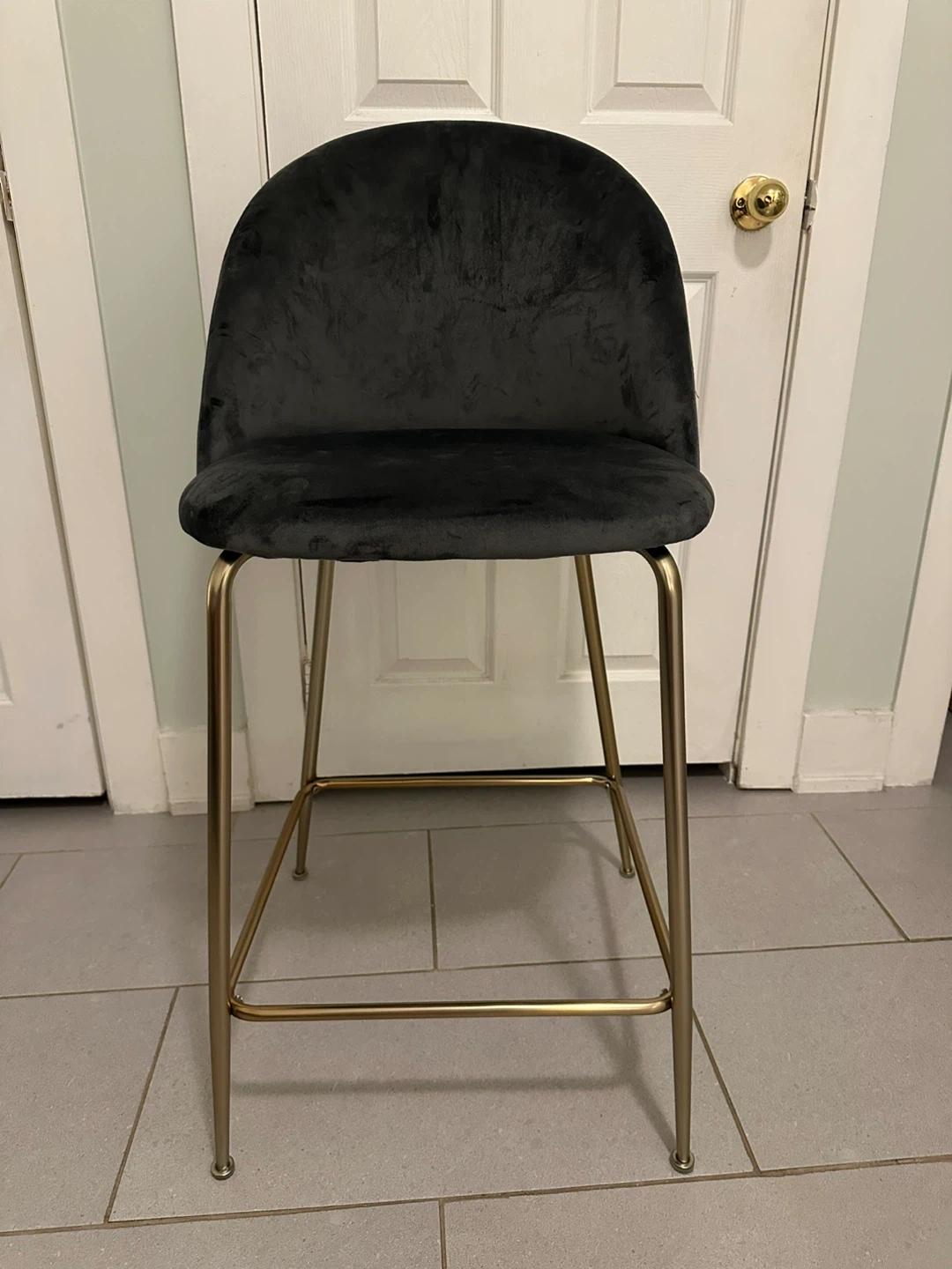 Selling a stylish bar stool featuring a soft grey velvet seat and sleek gold legs. The quilted back adds a touch of elegance to any kitchen or bar area. It's in great condition and ready for a new home!