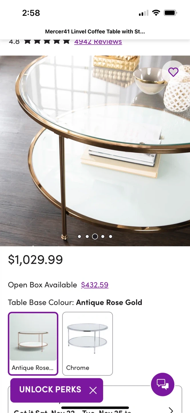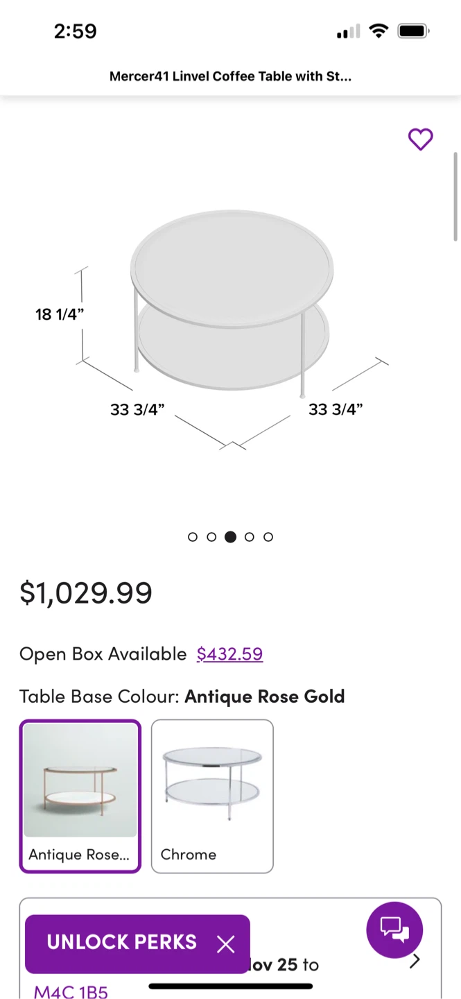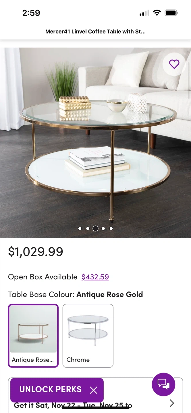 Selling a Mercer41 Linvel coffee table in antique rose gold. It's a stylish addition to any living space! The table's dimensions are 18 1/4" in height and 33 3/4" in diameter. Originally bought for $1,029.99
