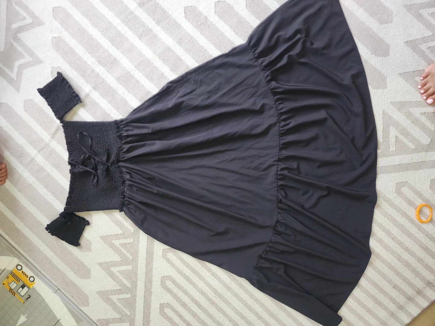 Selling a cute black off-the-shoulder dress! It's in great condition and would be perfect for summer or a night out. The fabric is flowy and comfortable, making it easy to wear. It's a stylish addition to any wardrobe!