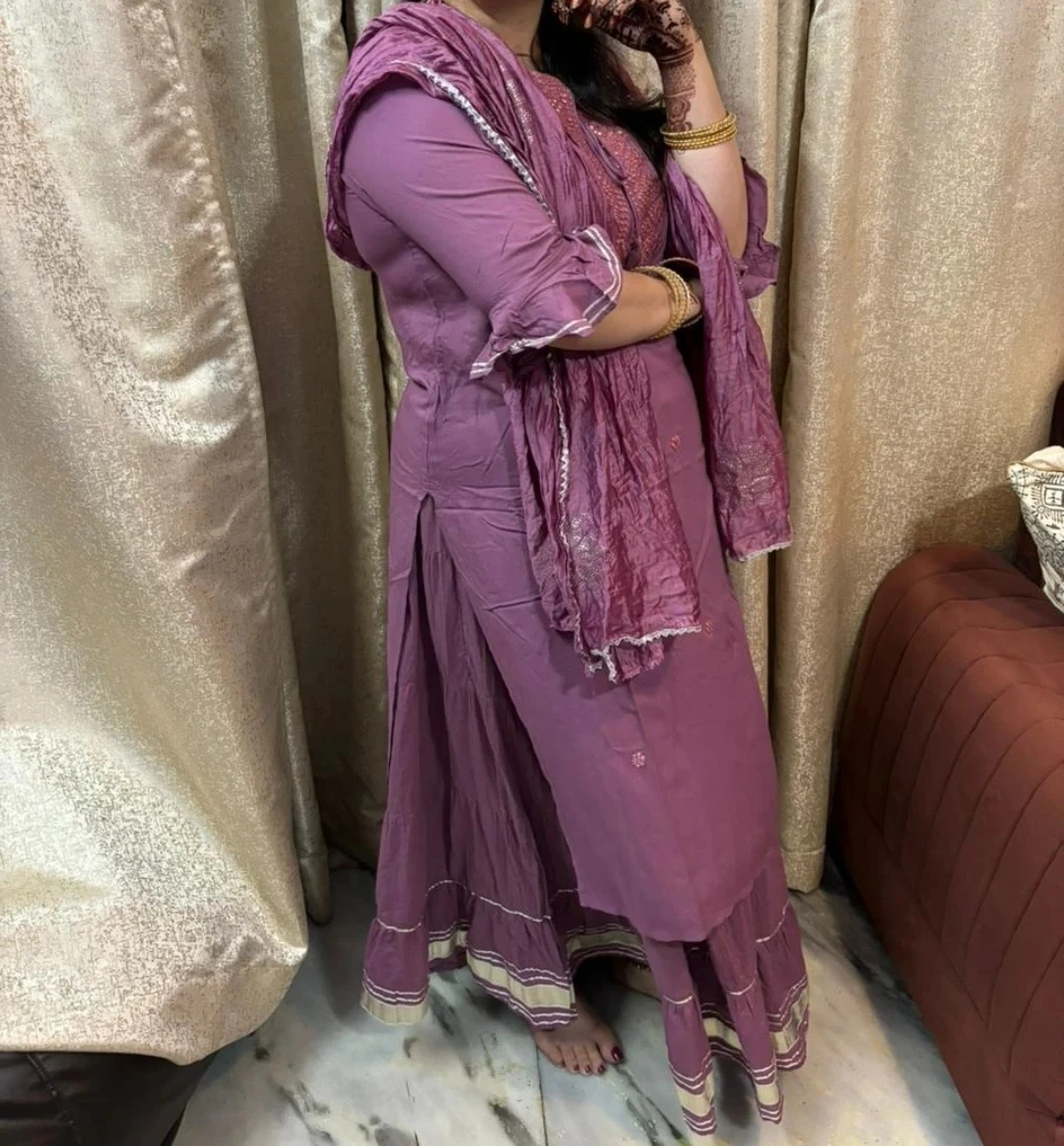 A lovely purple salwar kameez suit, perfect for a special occasion or just feeling a bit fancy! The colour is a beautiful shade of purple, and the fabric drapes nicely. It includes a long shirt (kameez) with Morrison work , loose trousers (salwar) with gotta patti and a beautiful scarf (dupatta).