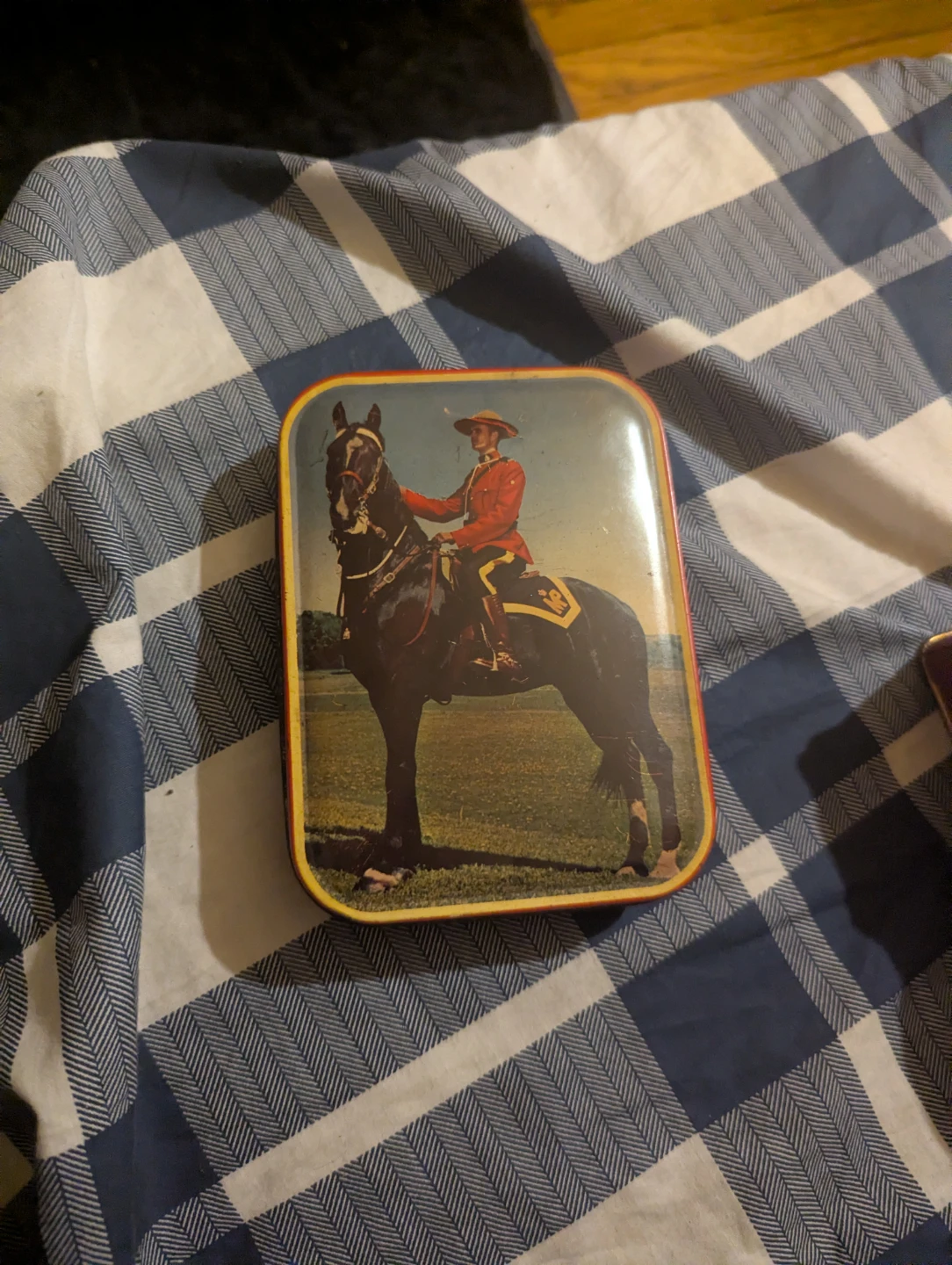 Selling a vintage tin featuring a Canadian Mountie on horseback. It's in good condition and would be a great addition to any collection