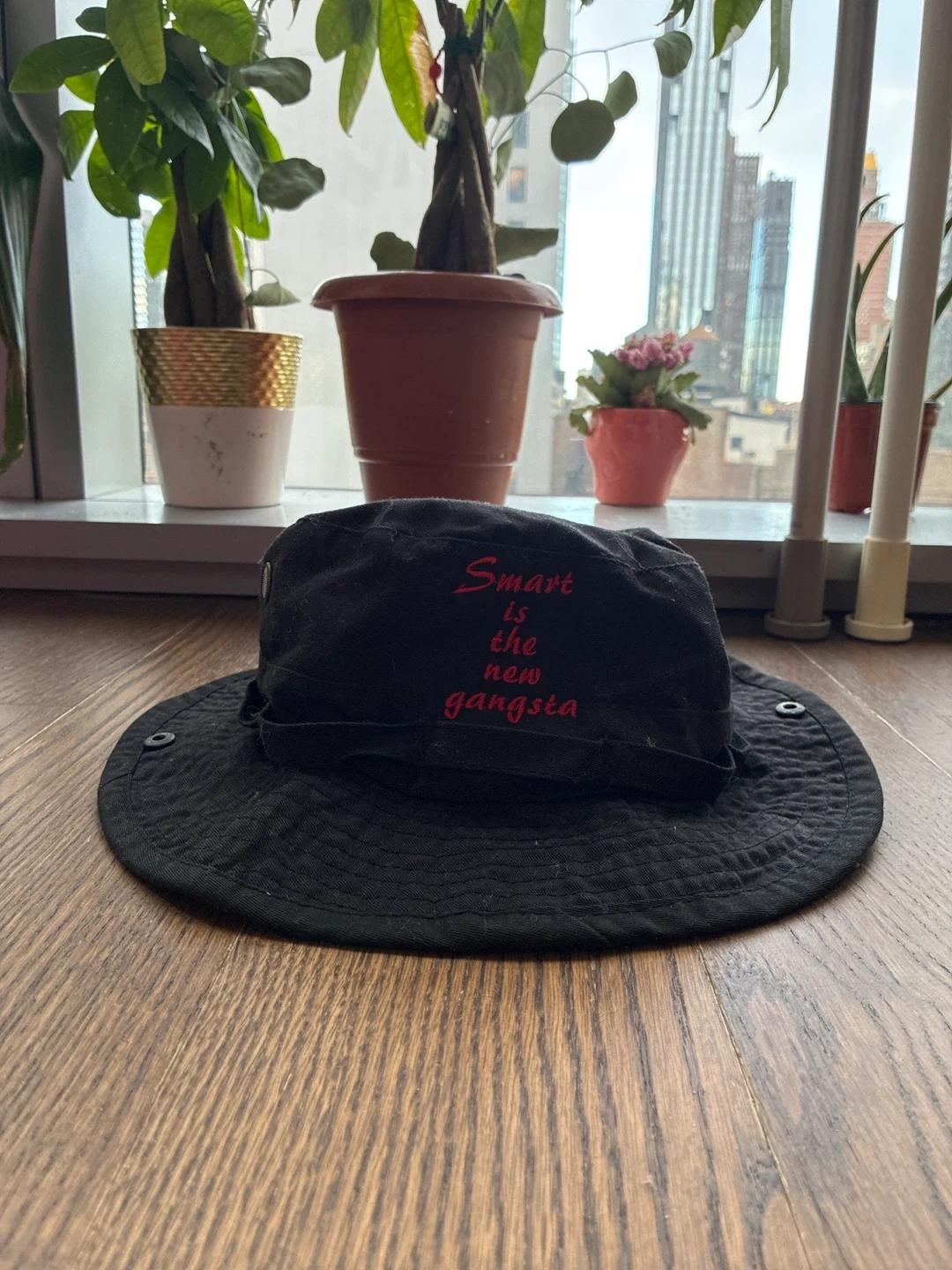 Black bucket hat with a red embroidered design. It's in great condition and ready for a new home!
