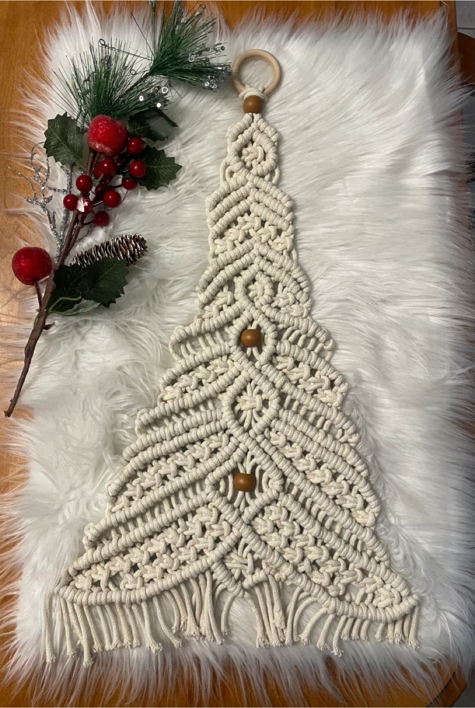 Looking to add a touch of handmade charm to your holiday decor? This macrame Christmas tree wall hanging is perfect! It features a beautiful woven design with wooden bead accents and a wooden ring for easy hanging. It's in new condition and ready to bring some cozy vibes to your home this season