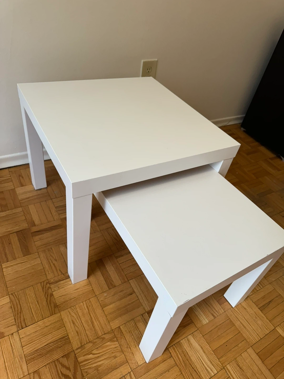 355PICK UP ONLY. No holds. First come basis. Selling a white Ikea LACK side table! Plus smaller table (free)! It's in great shape and measures 55x55 cm (21 5/8 x 21 5/8 inches). The height is 45 cm (17 3/4 inches). Perfect as a small coffee table or nightstand!