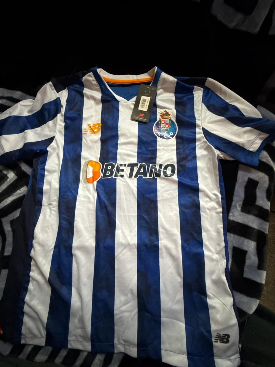 Selling a New Balance FC Porto jersey. It's in new condition and has a cool design with blue and white stripes. Perfect for any soccer fan!