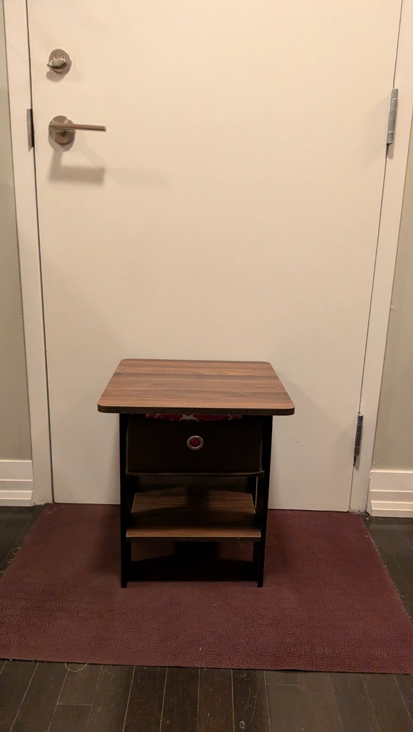 310A cute little nightstand with a drawer and two shelves for storage! The top is a nice wood grain pattern and the frame is black. Perfect for beside your bed or as a small side table in any room