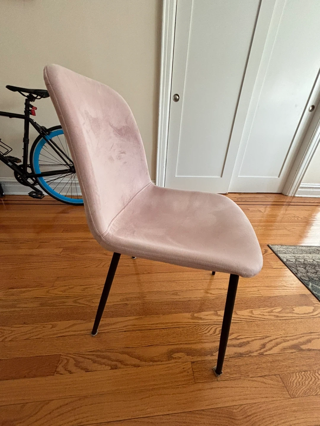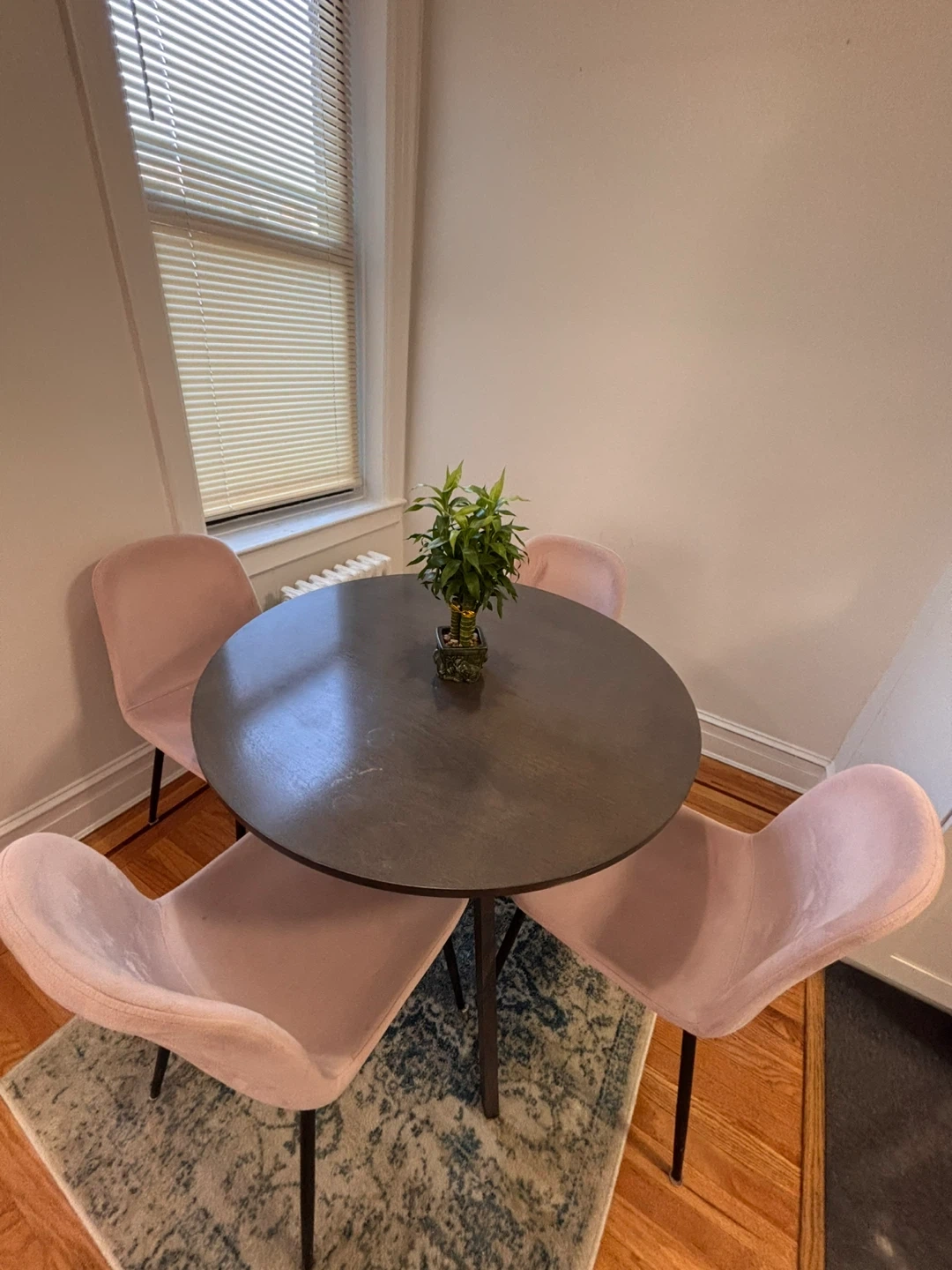 Selling a round dining table with four stylish pink velvet chairs. This set is perfect for a smaller dining space or kitchen nook. The chairs are comfortable and add a touch of elegance with their soft velvet texture. The table is sturdy and in good condition, ready to be the centerpiece of your dining area!
