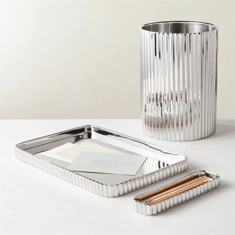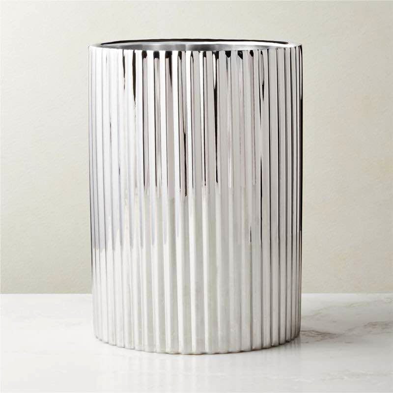 Elevate your space with this sculptural, high-end accent piece from CB2. Polished steel is pleated to create a clean, dimensional aesthetic — perfect for luxe minimal, masculine-editorial interiors.