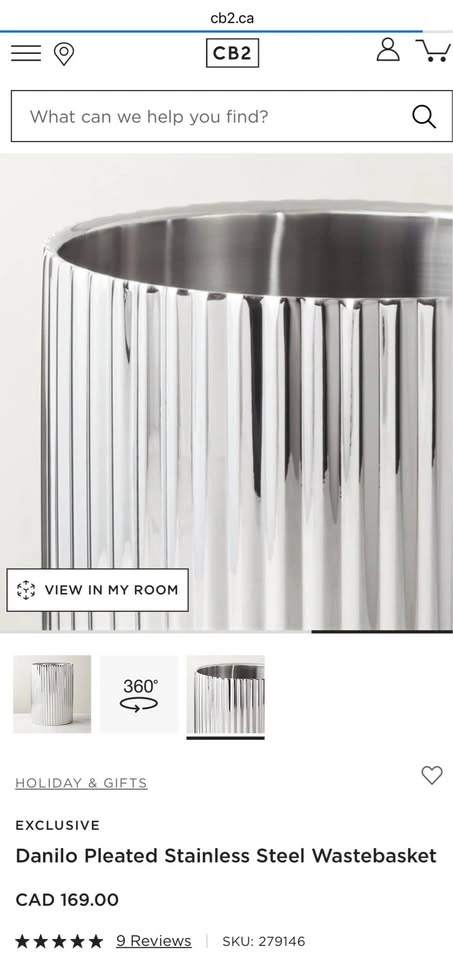 Selling this stunning CB2 stainless steel pleated wastebasket — brand new with tag. Never used, just changing up my style. Sleek, modern, and perfect for a luxe minimal space. Retails for $169 plus tax.