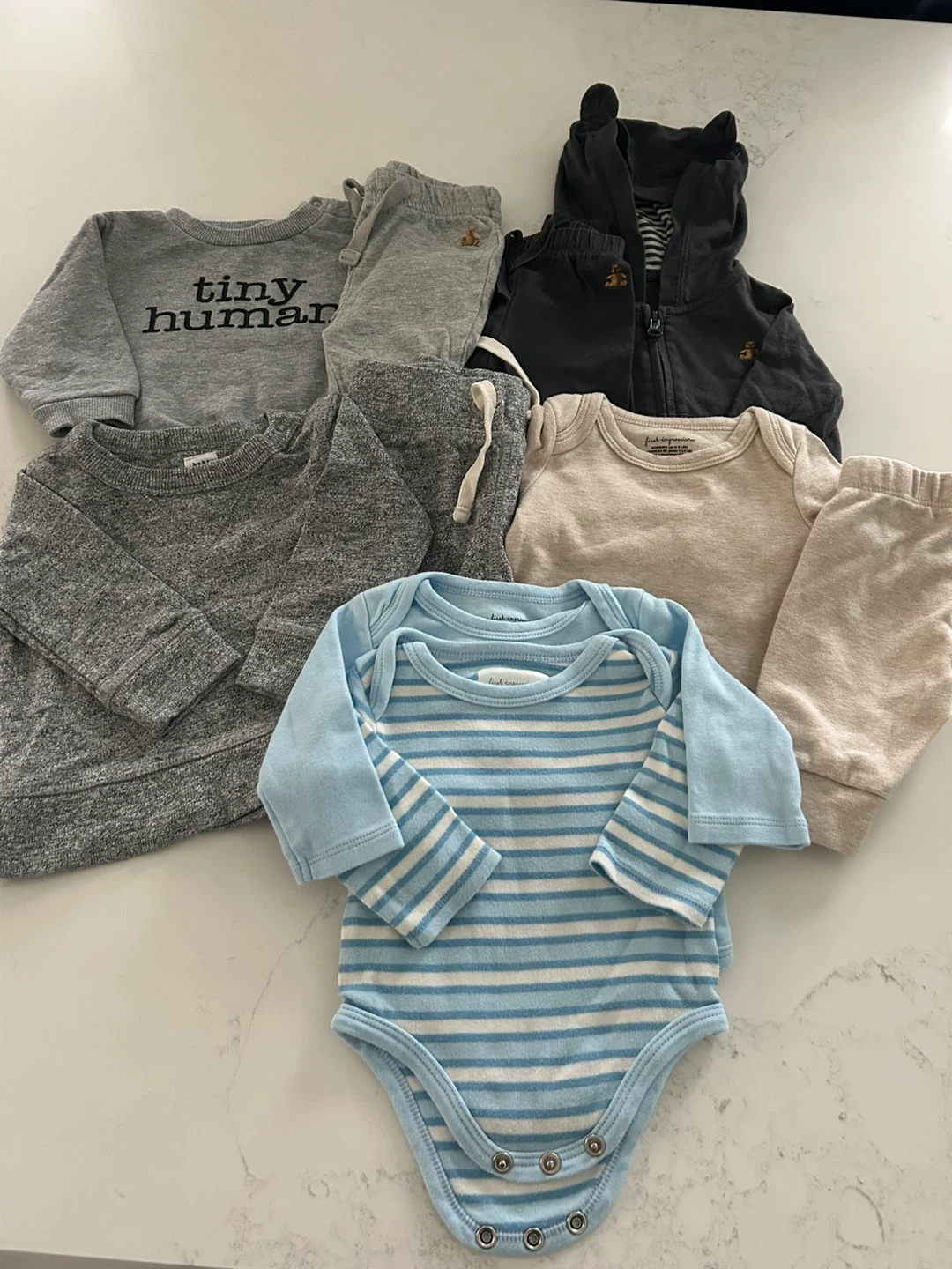 Selling a bundle of baby clothes, perfect for newborns up to 3 months old! Includes brands like First Impressions and Gap. A mix of onesies, sweaters, pants, and a sleep sack. All in great condition and ready for a new little one!