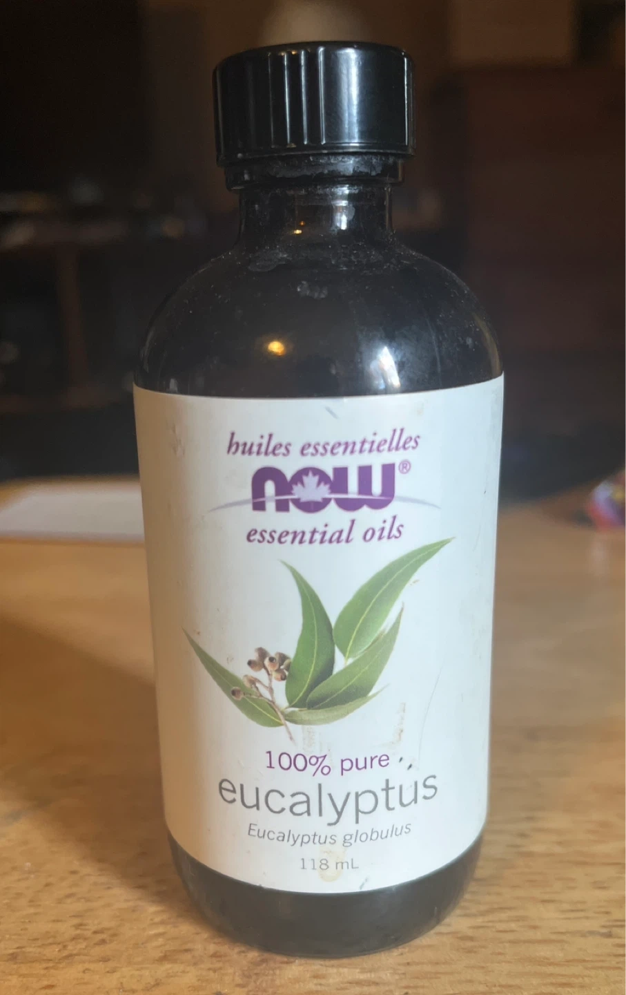 Selling a bottle of NOW Eucalyptus essential oil. It's 100% pure and comes in a 118 mL bottle. Some has been taken and put in a smaller jar. We don’t use it often. Second Last image shows where it is full too.