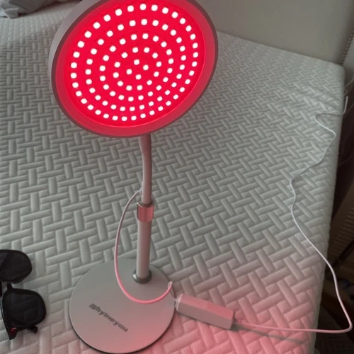 This stylish tabletop device is equipped with 100 top - notch LED beads. Use Distance and Frequency: Place the red light lamp 5-10 inches away from your body. Suggested use time: 10-30 minutes per session. Frequency: 3-6 times per week for 4-5 weeks. Intelligent Timer - device comes with a sturdy base and a 360° adjustable gooseneck. This design allows you to effortlessly direct the light to various body areas from different angles. No need to constantly keep an eye on the time, as the device will automatically shut off once the set time is up Adjustable Height and Brightness: This versatile lamp adjusts in height from 11.02 to 14.57 inches and offers 3 brightness levels plus 360° horizontal adjustments. Find your perfect comfort level and desired brightness to suit your specific need 650nm and 850nm deep red light This is red light only. Comes with eye protection