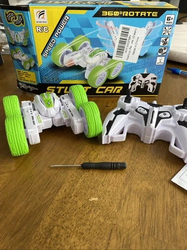 The Qi Fan Toys RC Battery Operated Stunt Car is a thrilling choice for all ages, featuring a 360-degree rotation capability for impressive stunts. This white plastic car is ready to go right out of the box, making it perfect for off-road and on-road adventures. Battery operated with charging cable for car. This Toy Grade model is suitable for children aged 4 and up, as well as adults looking for exciting RC fun. Made in China, this stunt car promises hours of entertainment for hobbyists and enthusiasts alike. This is basically new in box. Opened to test it indoors only. The car is approx 4 x4”.