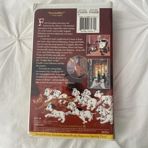 Ideal for a cozy family movie night or to add to your retro collection, this VHS tape offers a glimpse into the magical era of hand-drawn animation. "101 Dalmatians" is not just a film; it's a piece of animation history, encapsulating the creativity and wonder of Disney's golden age.