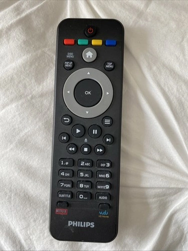 Genuine Original Philips RC-2802 Remote Control designed for Philips Blu-ray disc players. This black remote control is compatible with Philips devices, offering convenience and ease of use. Enhance your home entertainment experience with this authentic Philips remote control. This remote is missing the battery case lid