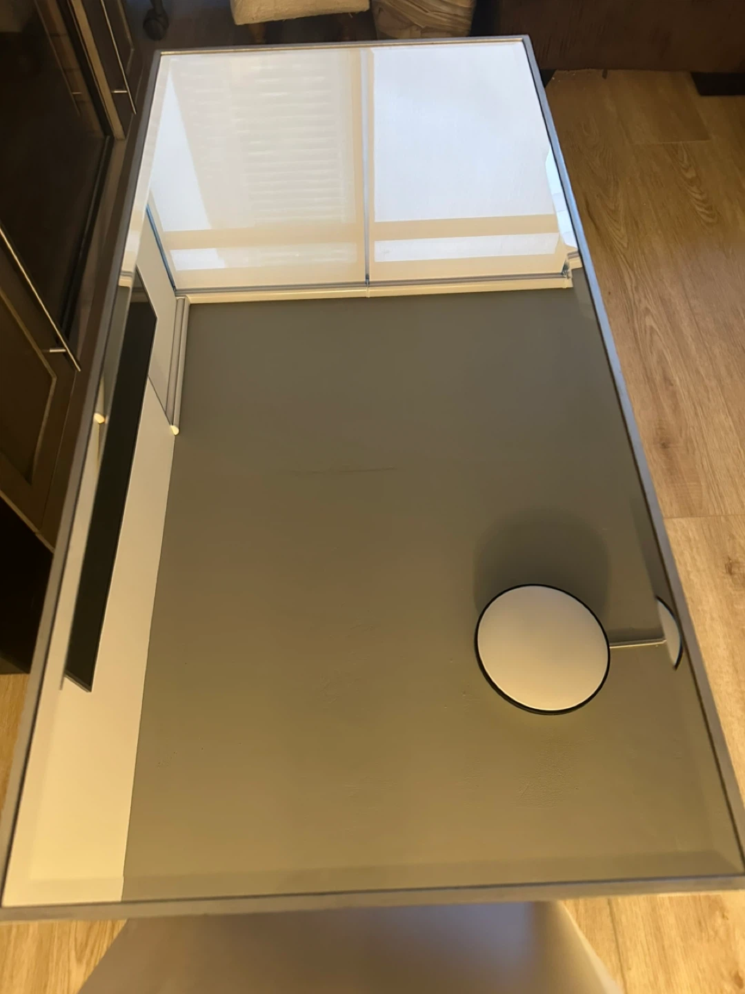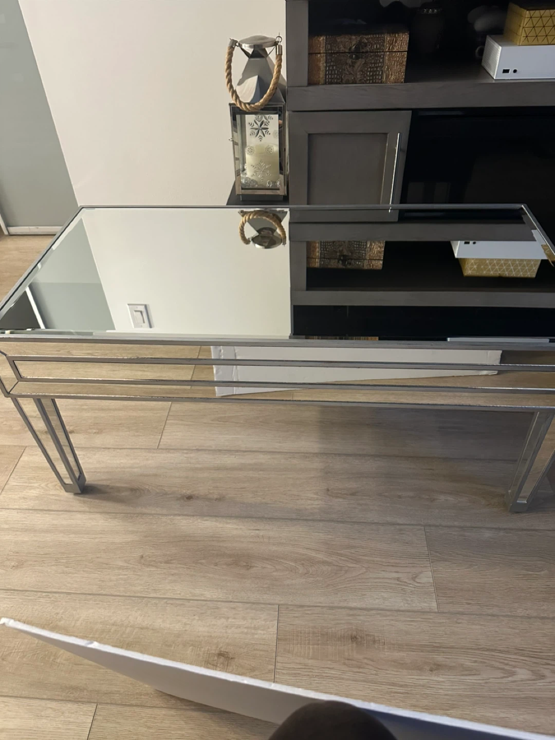 This mirrored coffee table features a sleek silver finish. It's a stylish piece that can add a touch of elegance to any living room. The table dimensions are approximately 40" x 20" x 18"
