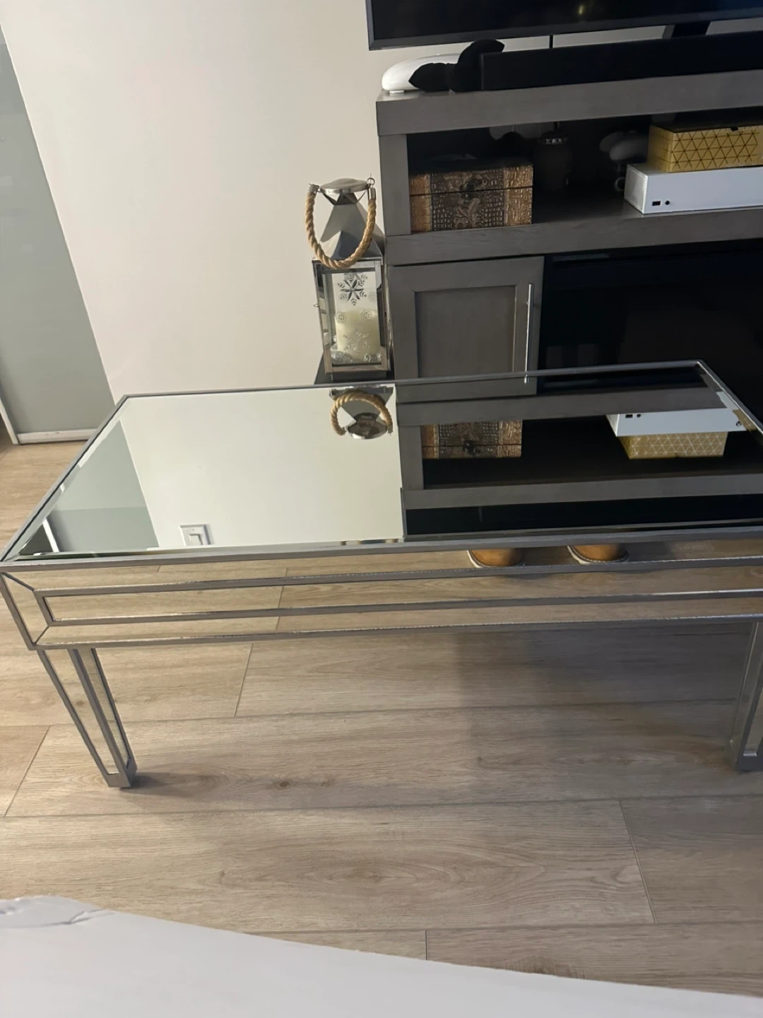 This mirrored coffee table features a sleek silver finish. It's a stylish piece that can add a touch of elegance to any living room. The table dimensions are approximately 40" x 20" x 18"