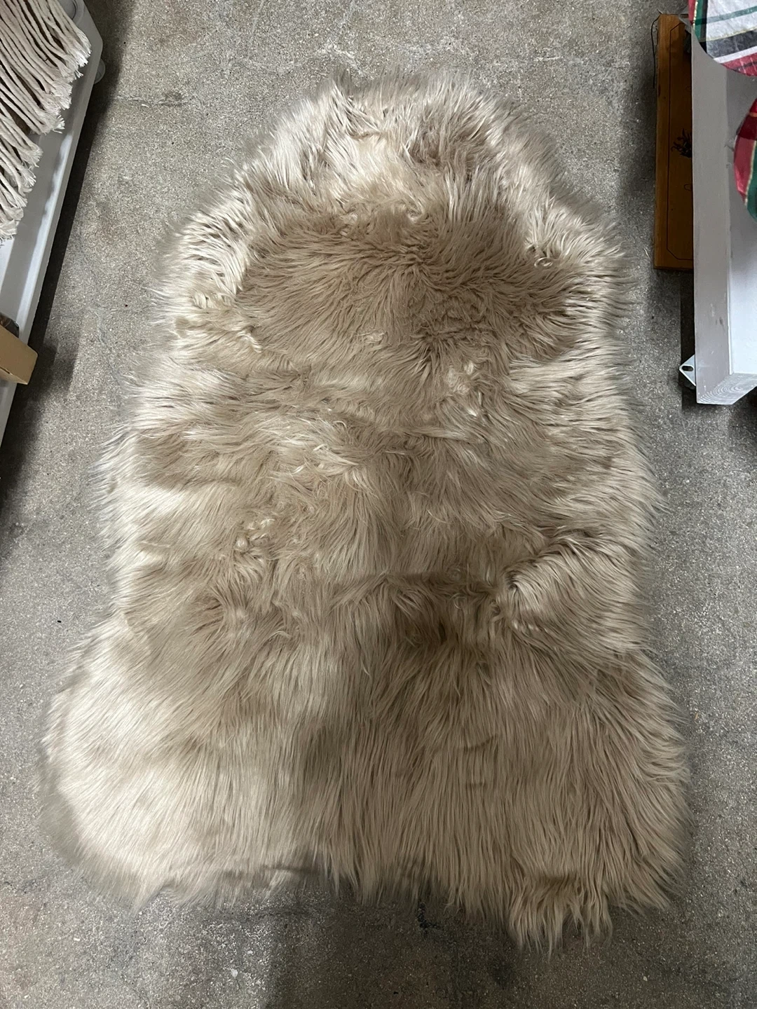 Selling a cozy faux sheepskin rug! It's a lovely beige colour and would be perfect for adding some warmth to any room. It's new. Dimension is 38”x25”.