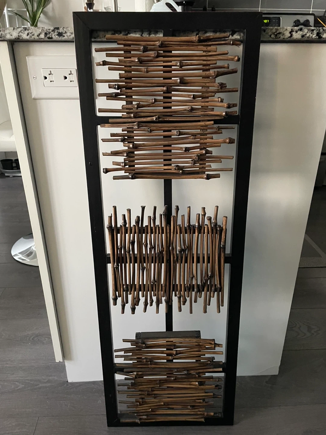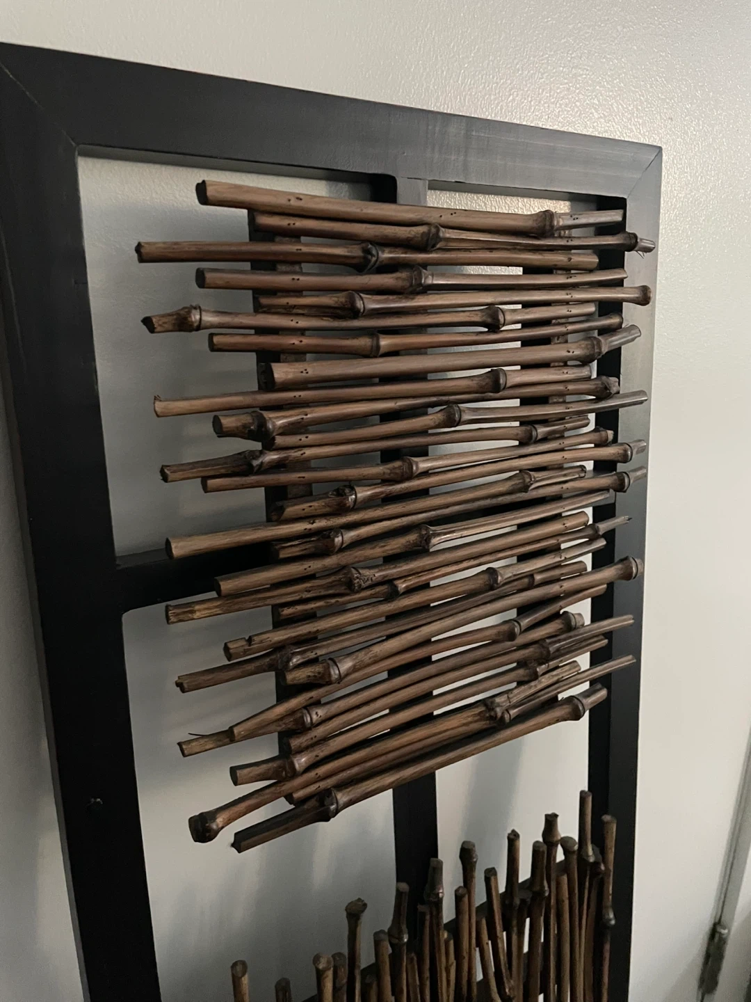 Unique bamboo wall art piece! It features a black frame with natural bamboo arranged in a modern design. It's in great condition and would add a touch of nature to any room