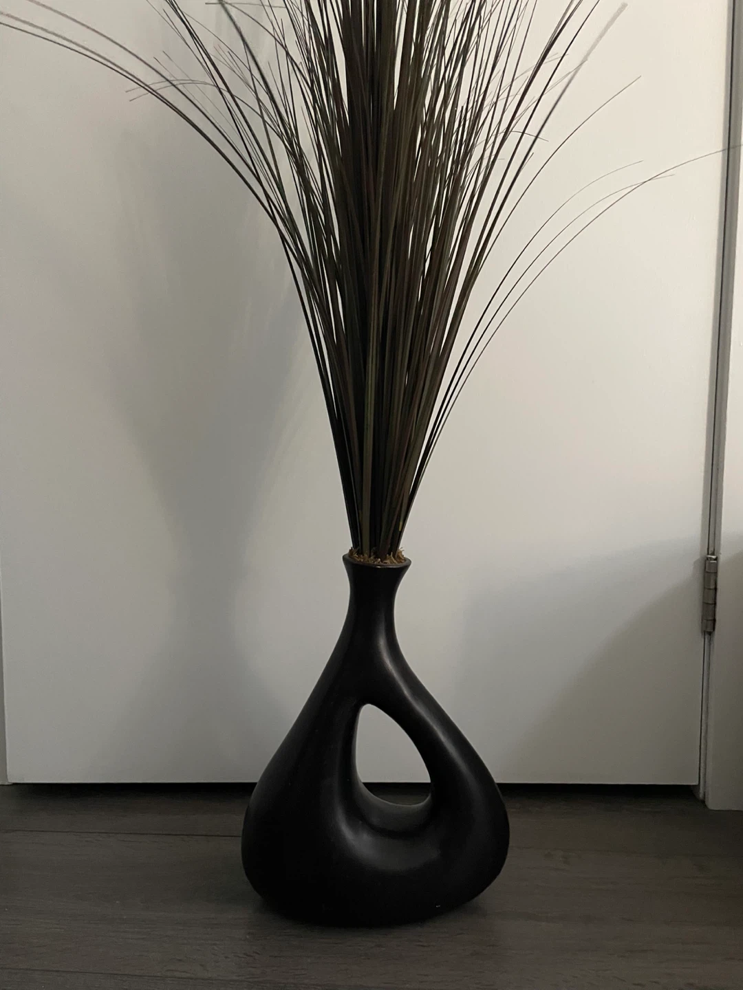 Selling a stylish black decorative vase, complete with an artificial plant. It's in great condition and would look lovely in any room! The vase has a unique design that adds a modern touch to your decor