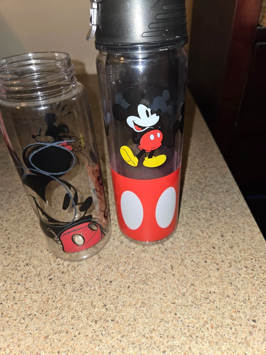 Selling a couple of Mickey Mouse water bottles! They're clear with Mickey Mouse designs on them. Great for kids or Disney fans!