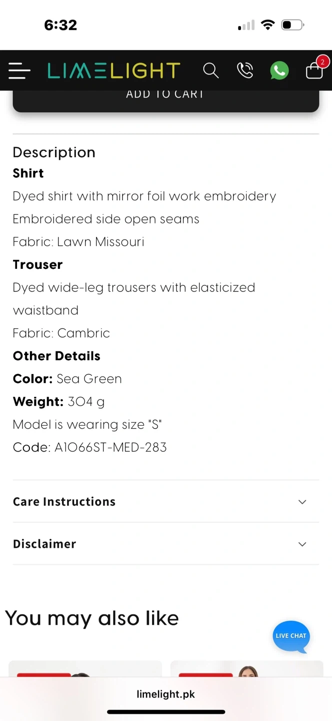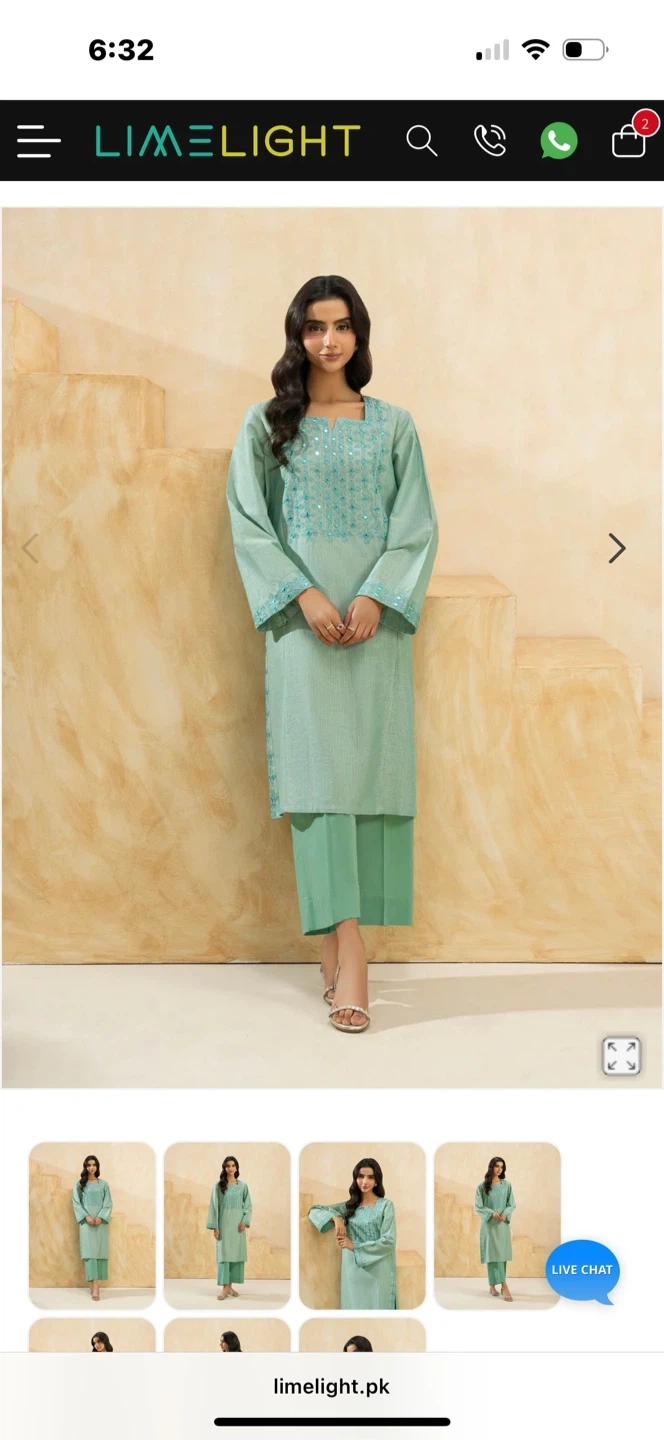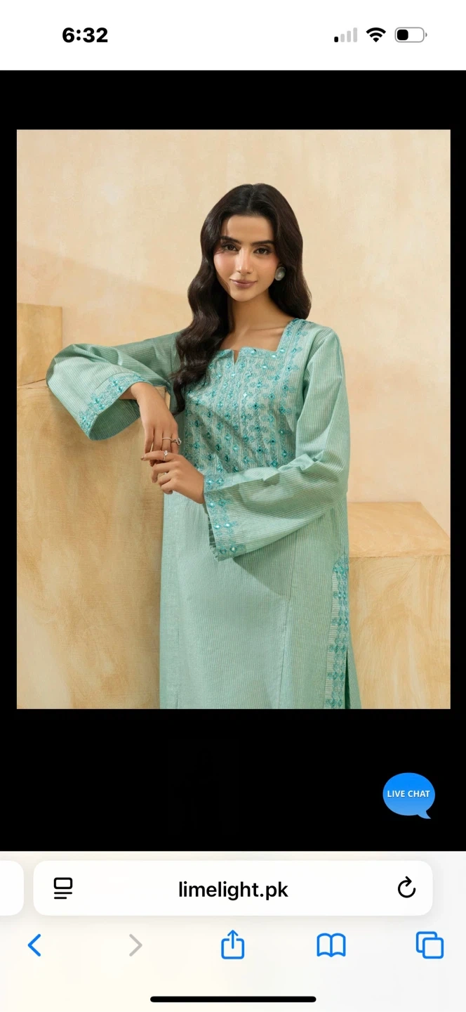 56Selling a beautiful Limelight sea green dyed shirt and trouser set. The shirt features mirror foil work embroidery and embroidered side open seams. It's made of lawn Missouri fabric. The trousers are dyed wide-leg with an elasticized waistband and are made of cambric fabric. Size medium