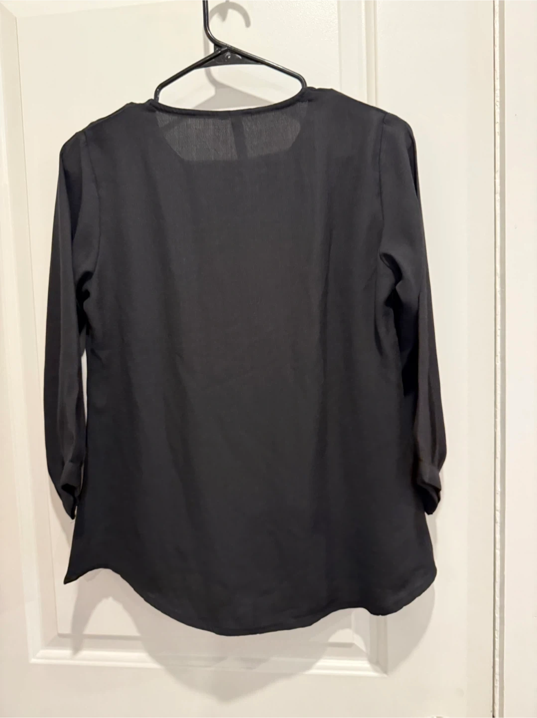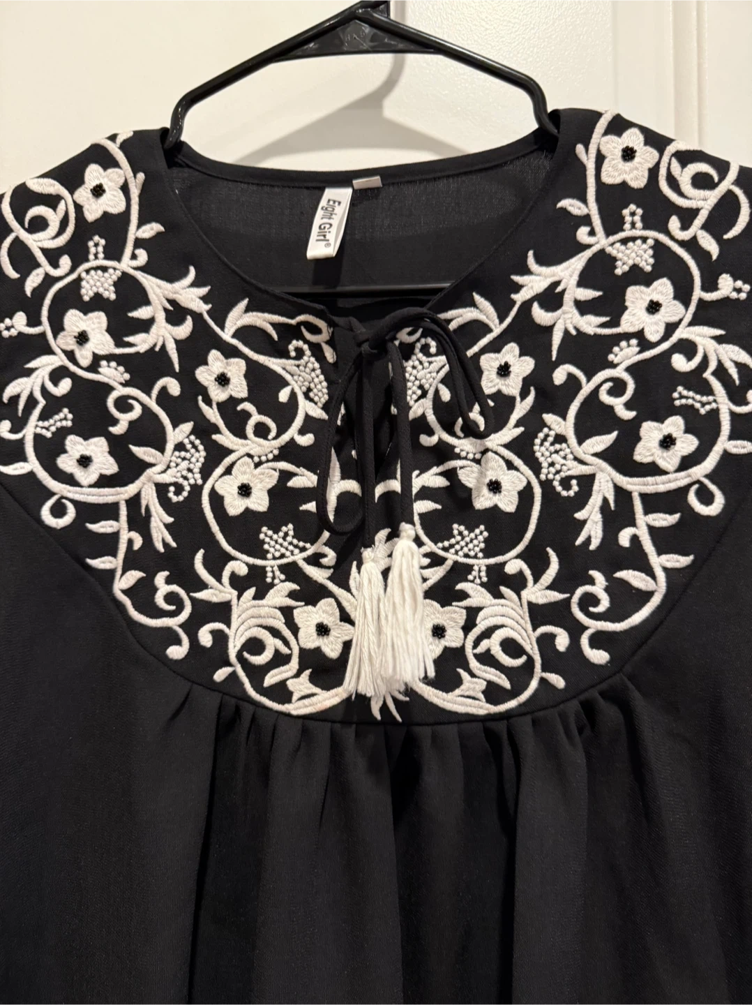 A lovely black blouse from Eighth Girl! It features beautiful white embroidery around the neckline and a flattering silhouette. Perfect for dressing up or down! Never used