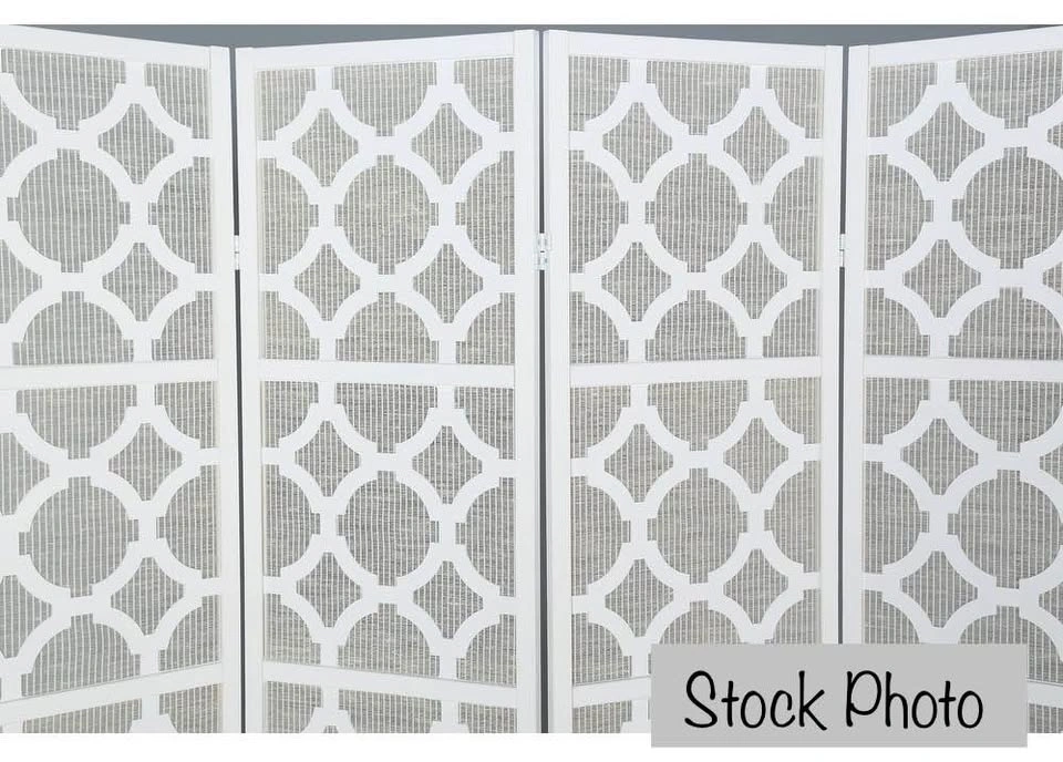 • Beautiful white frame with woven beige fabric inserts & a quatrefoil-patterned wood overlay