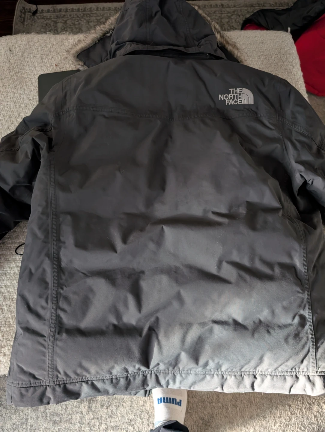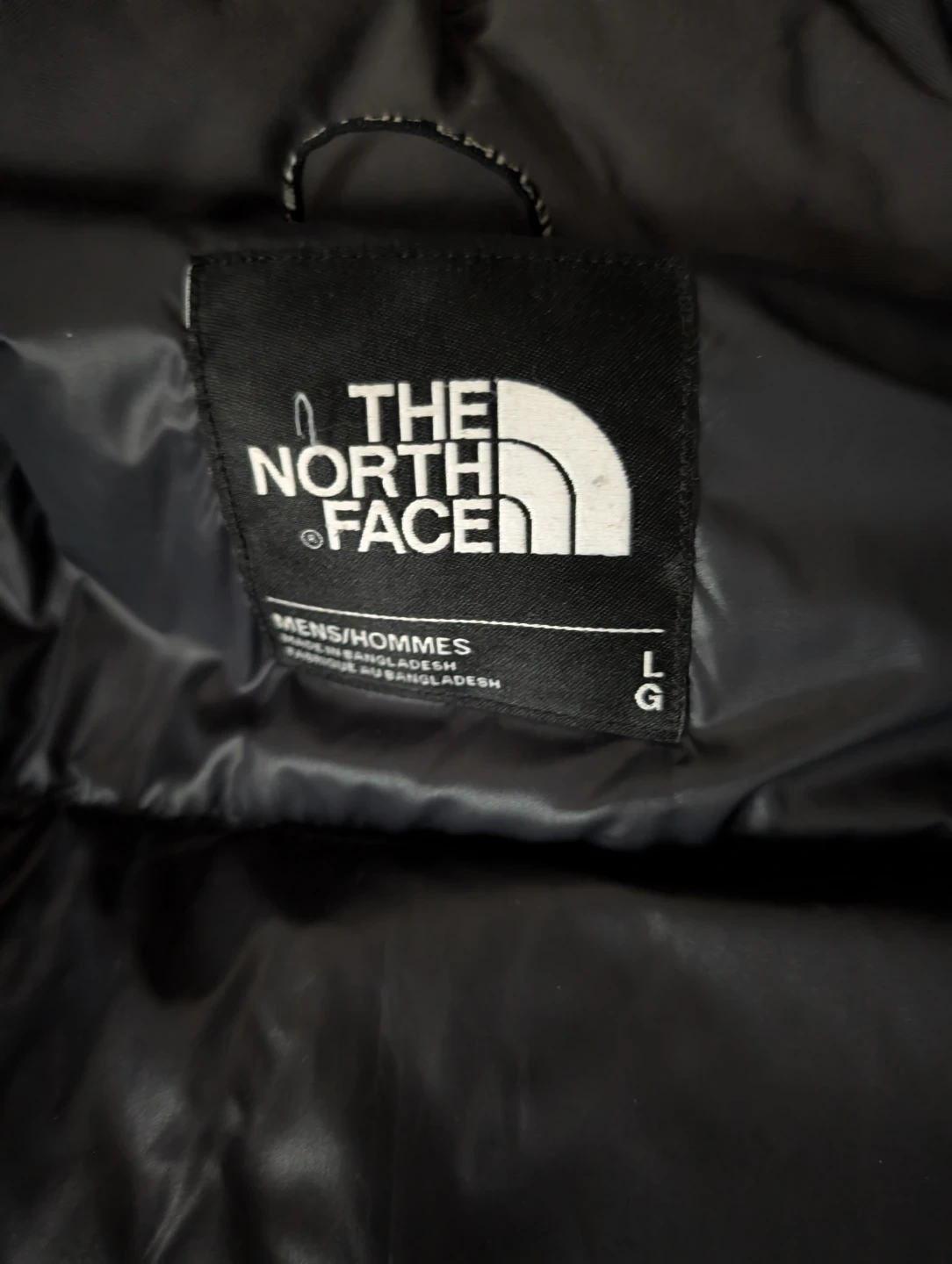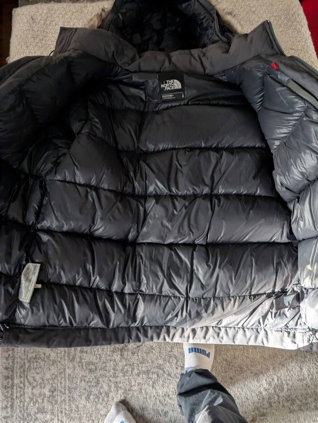92Selling a The North Face puffer jacket in size L! The jacket features a fur-trimmed hood and a stylish design.
