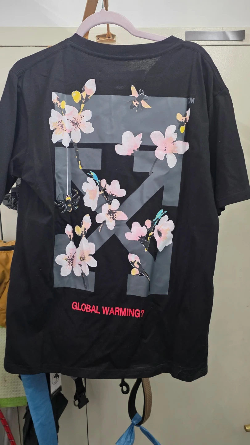 Selling a black Off-White T-shirt with a "Global Warming?" design. It features the iconic Off-White logo with a floral graphic on the back. Great for adding a streetwear touch to your wardrobe!