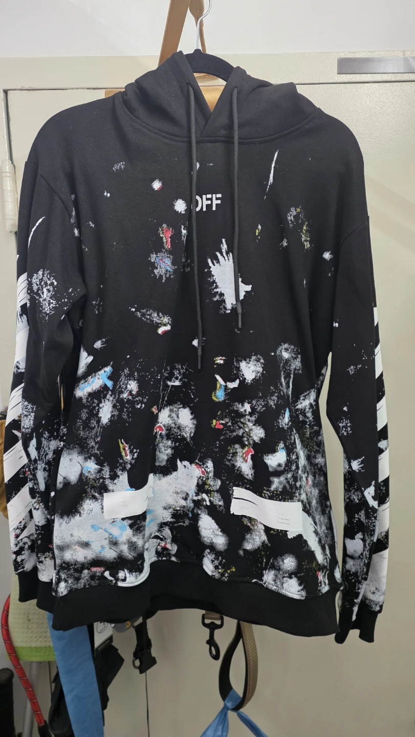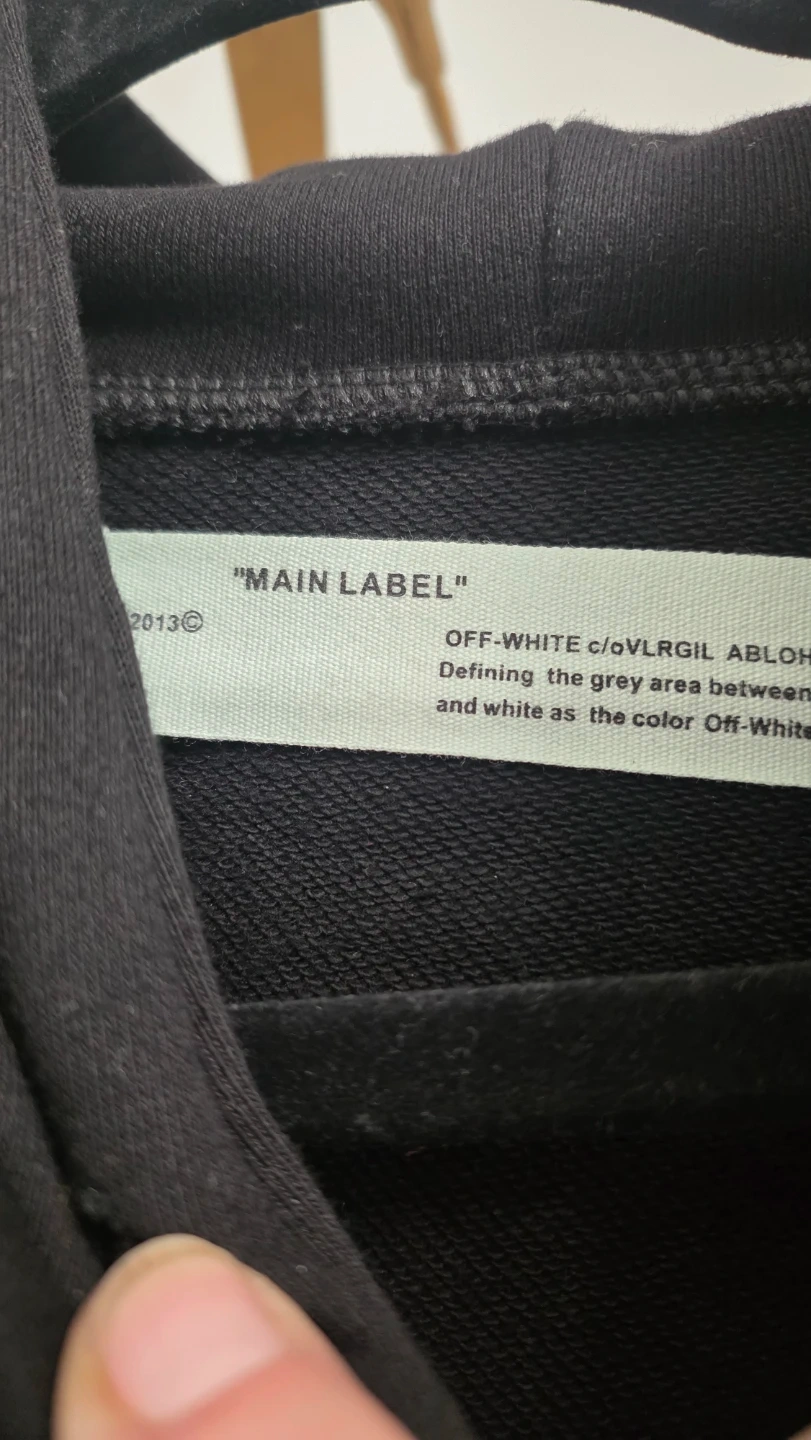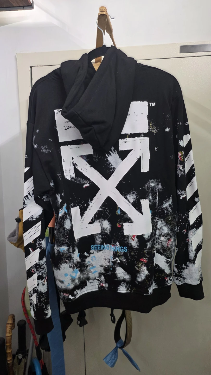 Selling a stylish Off-White "Seeing Things" hoodie in black! The hoodie features the iconic arrow design on the back and unique graphics throughout. It's made from high-quality materials and is in great condition. Perfect for adding a touch of streetwear to your wardrobe
