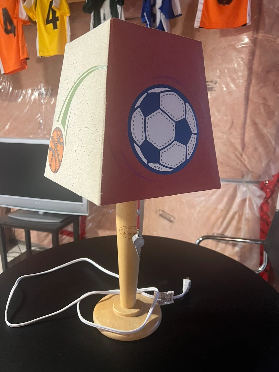- basketball, soccer, baseball, and football on each side of the lampshade.
