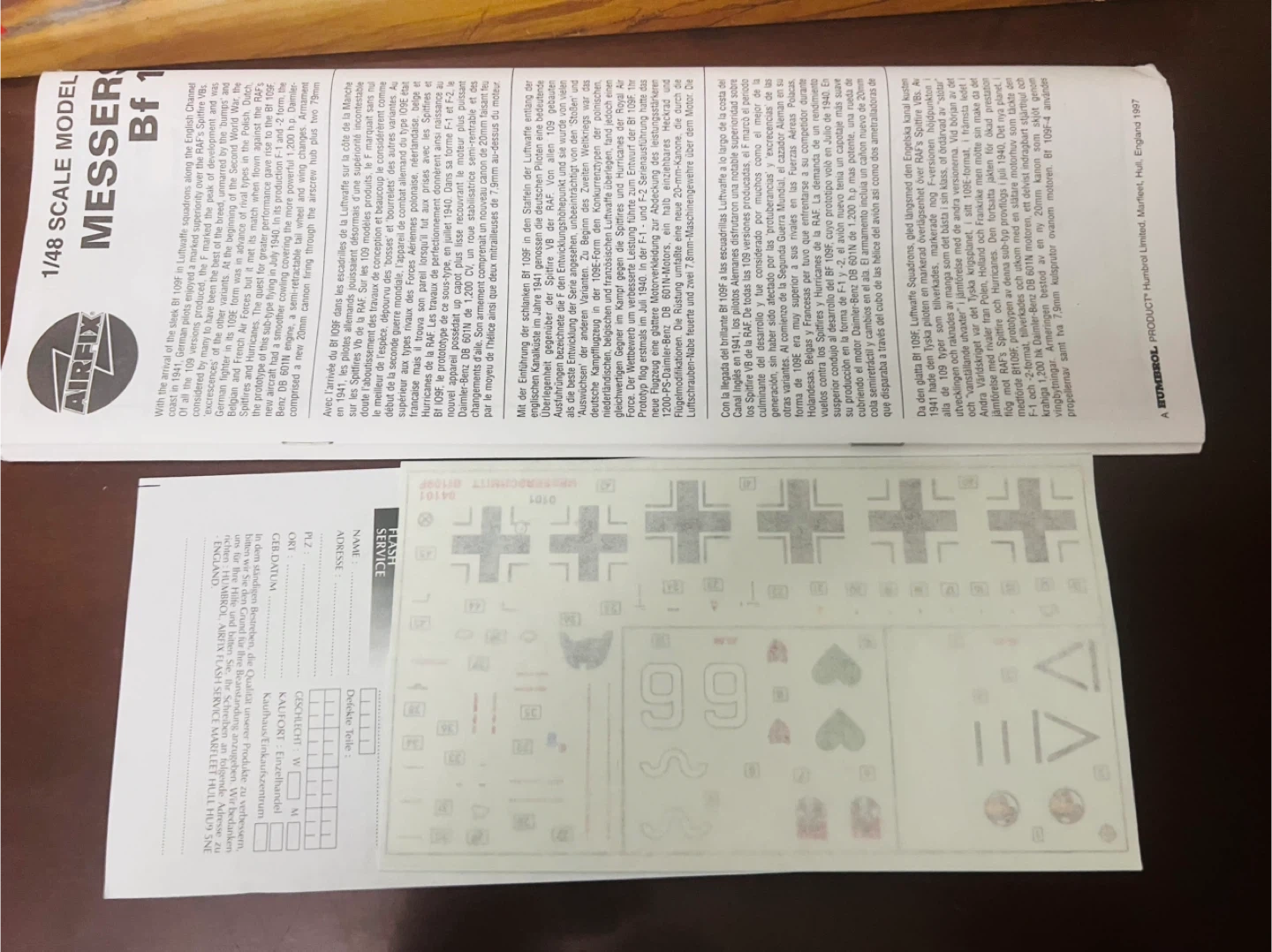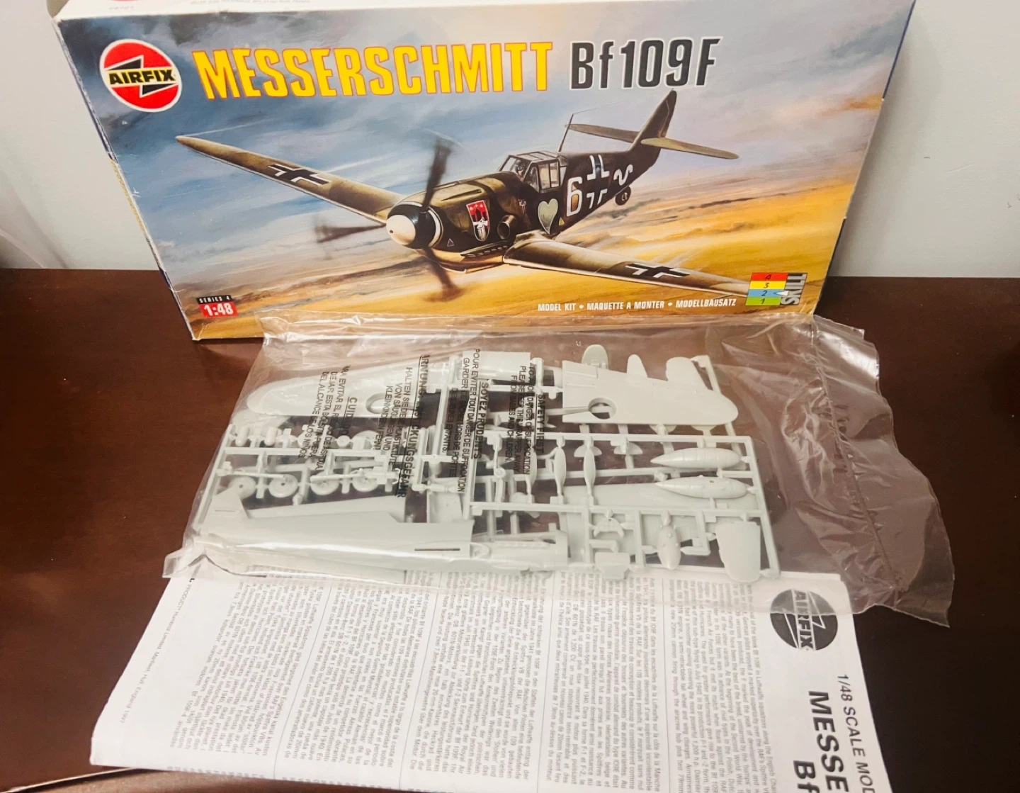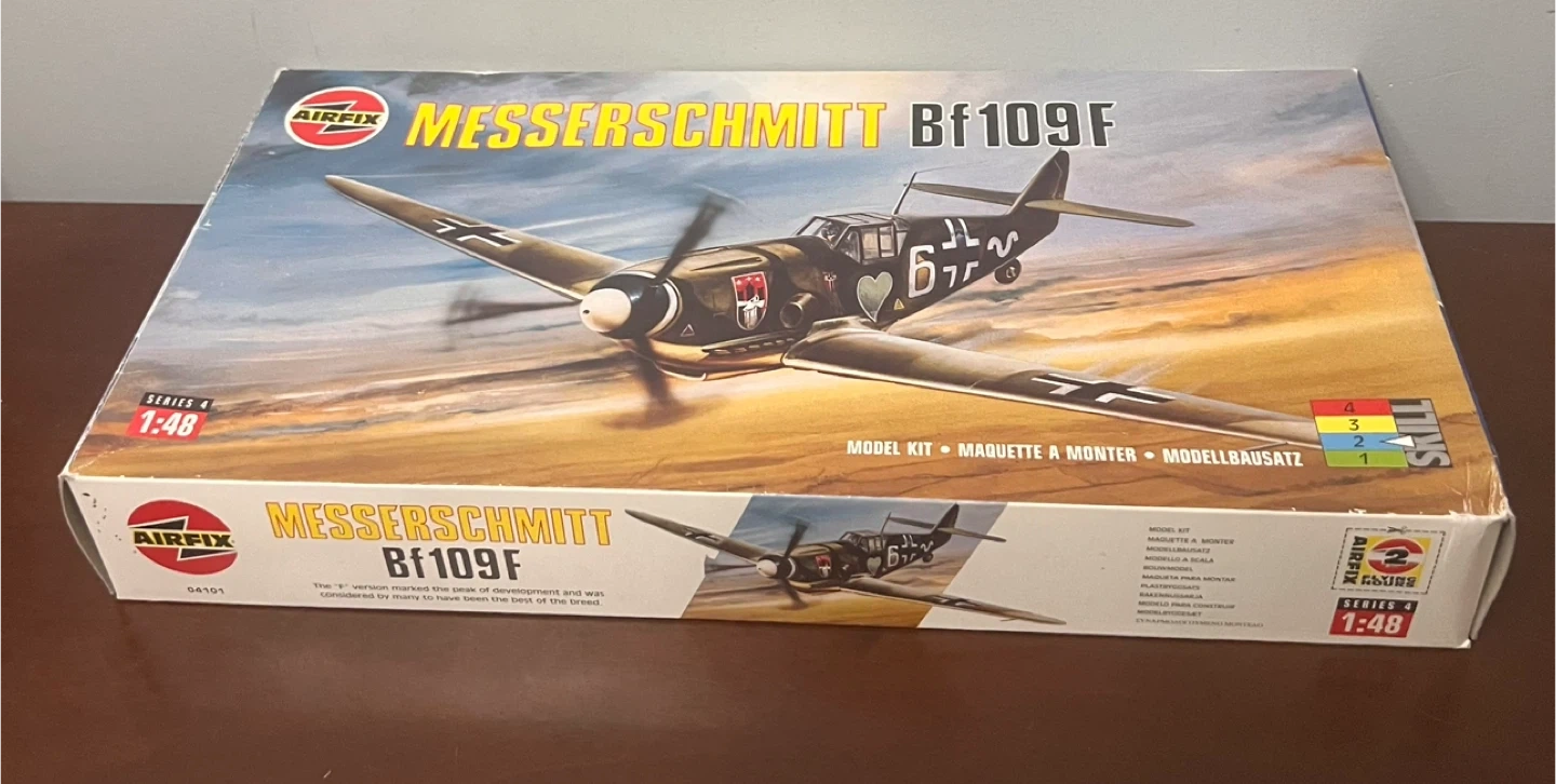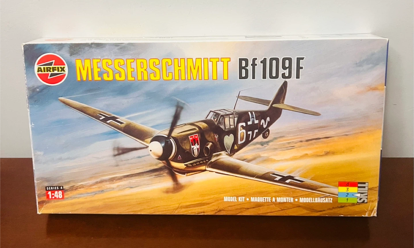 Selling an Airfix Messerschmitt Bf109F, a 1/48 scale model kit! It comes with the box and all the components are still sealed in the original packaging