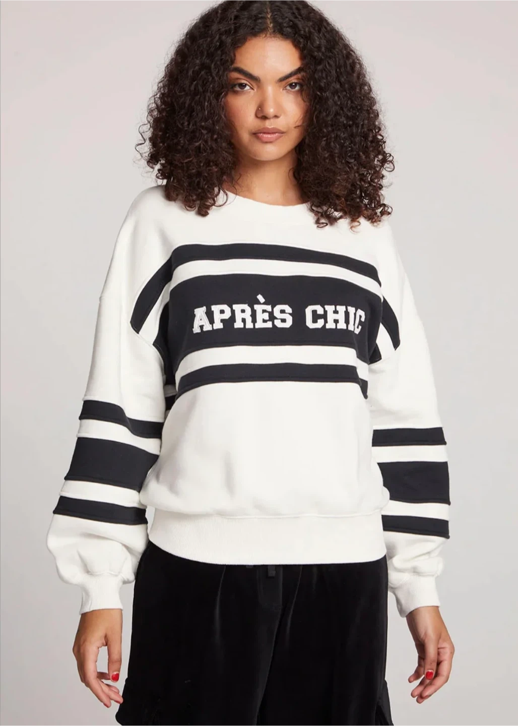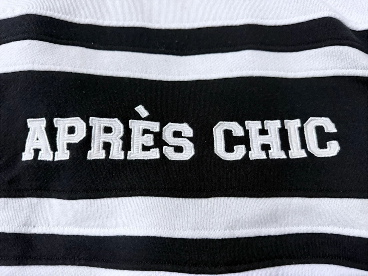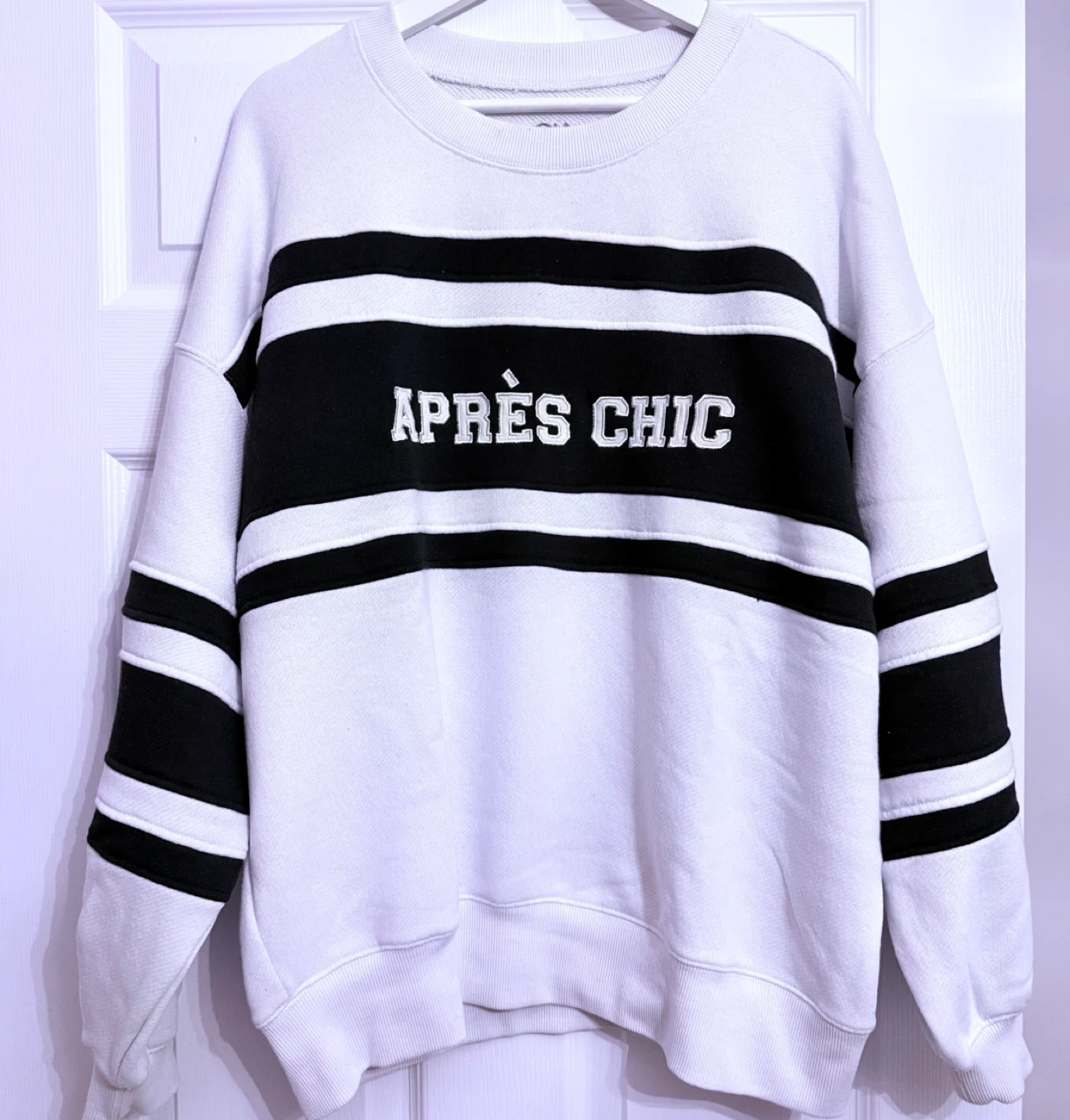 Cozy up in this stylish Après Chic sweatshirt! It features a classic white base with bold black stripes and the brand name across the chest. Perfect for a casual day out or lounging at home