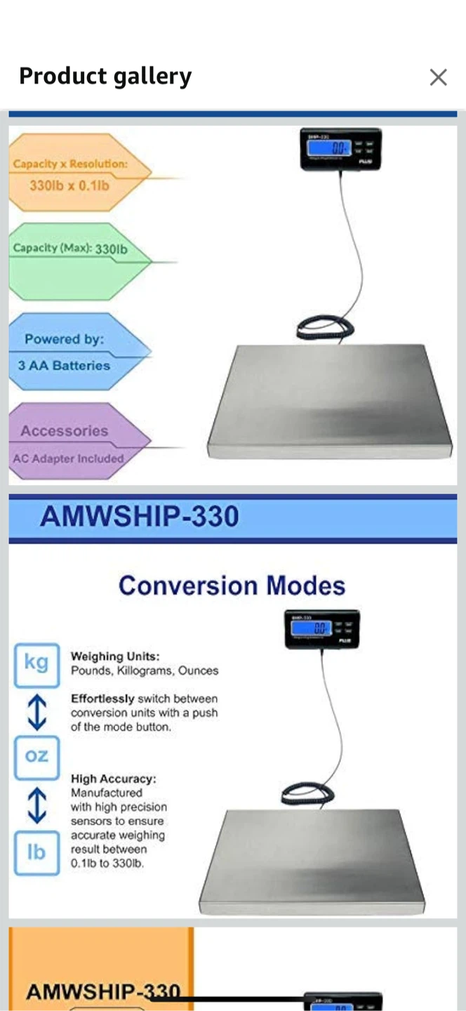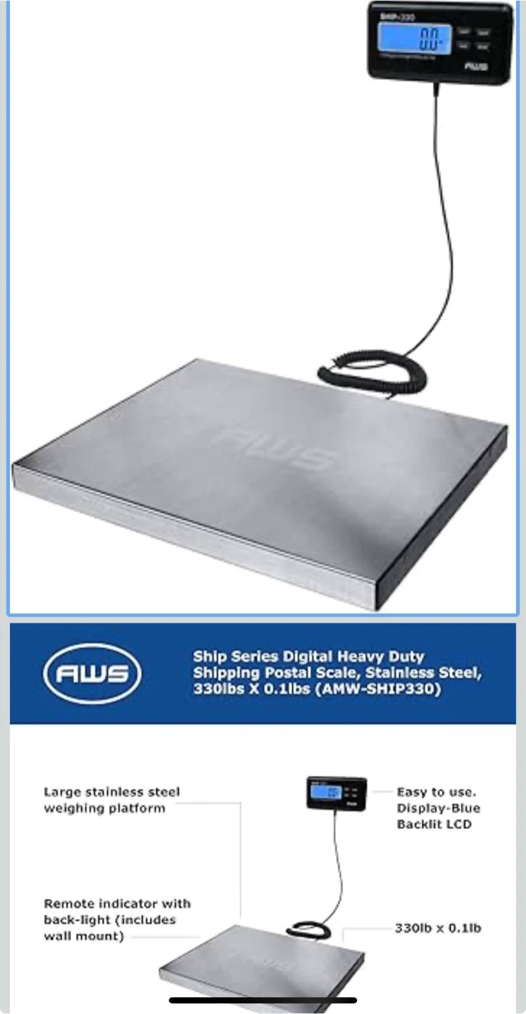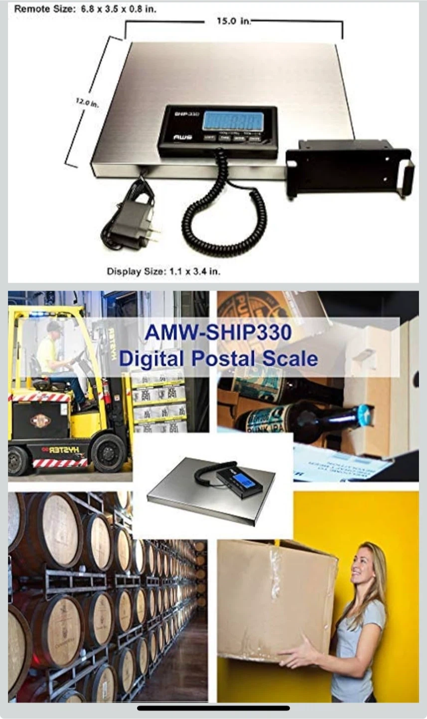 Selling an AWS AMW-SHIP330 digital postal scale! It's a heavy-duty shipping scale made of stainless steel. It can weigh up to 330lbs with a resolution of 0.1lb. It also features an easy-to-use display with a backlit LCD