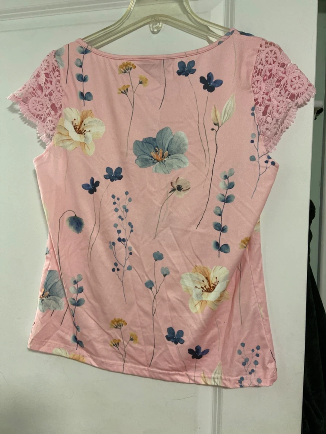 Selling a ChicMe top in size large. It's a pretty pink colour with a floral print and lace detailing on the sleeves. In great condition!