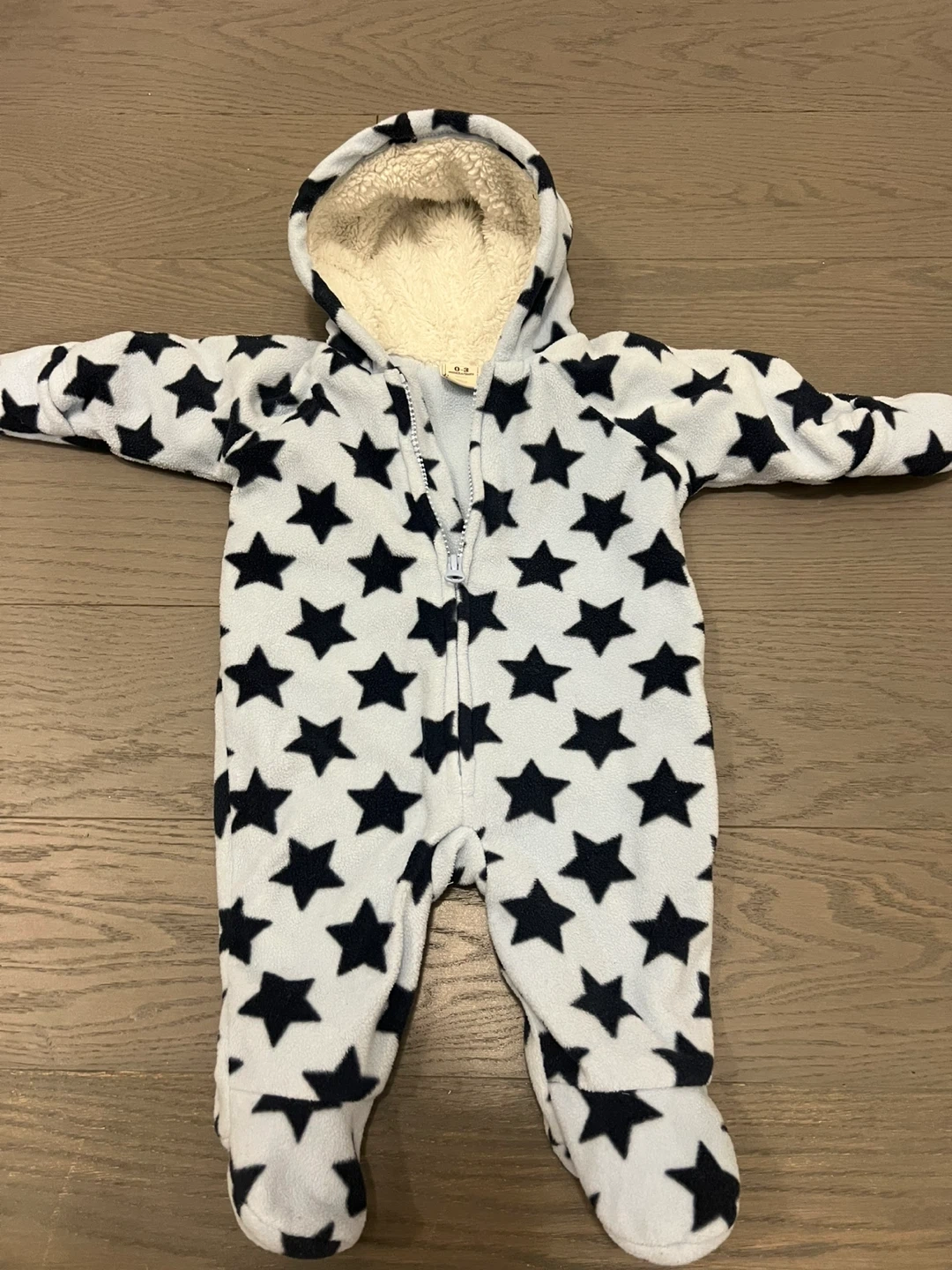 A cozy Old Navy baby fleece onesie in size 0-3 months. It features a soft, plush lining and a cute star pattern. Perfect for keeping your little one warm and snug!