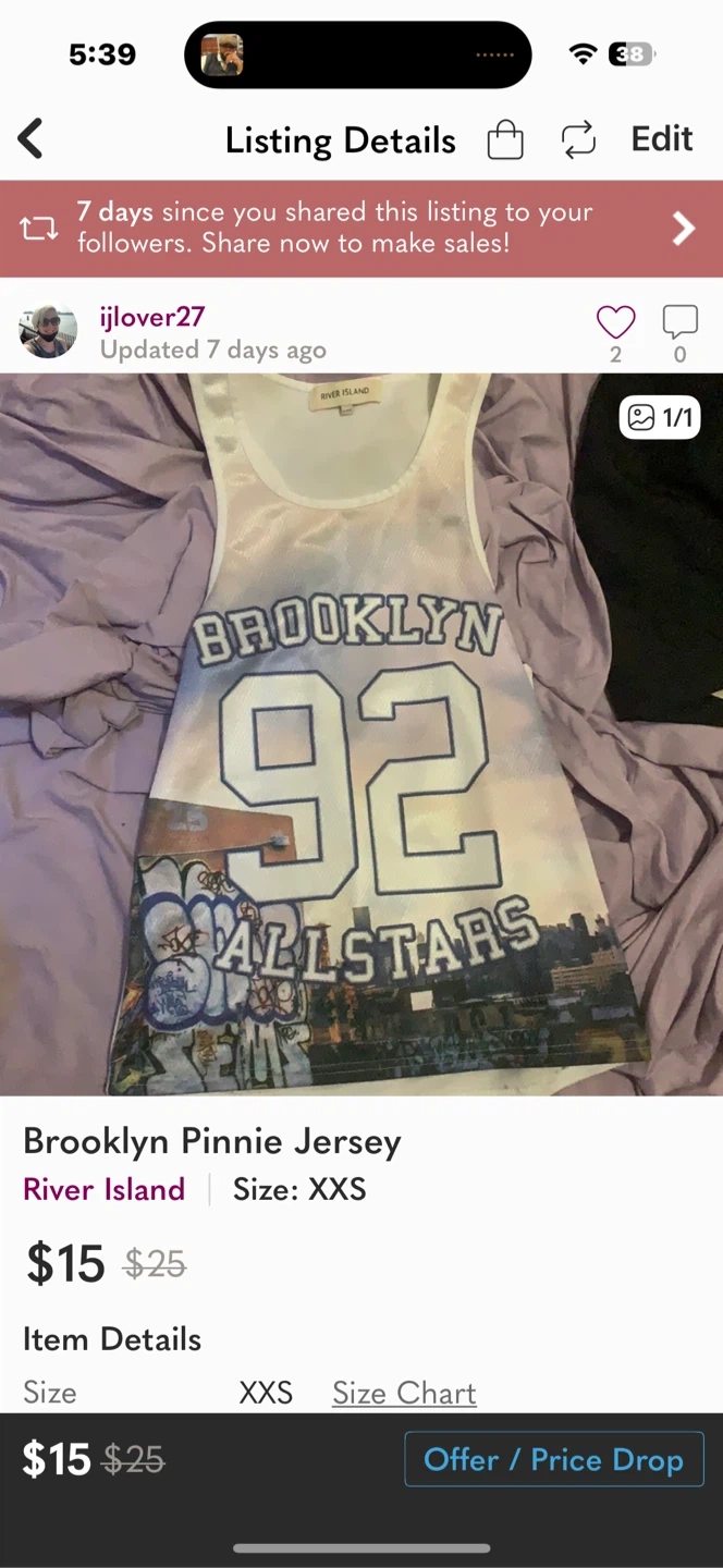 Selling a River Island Brooklyn Pinnie Jersey in size XXS. It features the number '92' and 'ALLSTARS' design. Originally listed for $25!