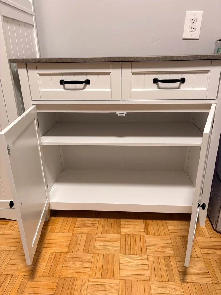 Sturdy, clean cabinet with two drawers and an adjustable shelf. Great as a microwave stand, extra kitchen storage, or pantry. Recently bought, selling because I’m moving and won’t need this piece.
