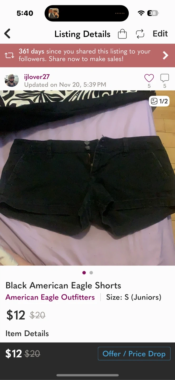 Selling a pair of American Eagle black shorts in size small (juniors). The original price was $20, but I'm selling them for less!