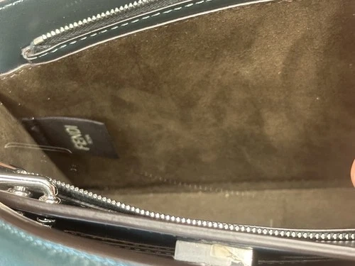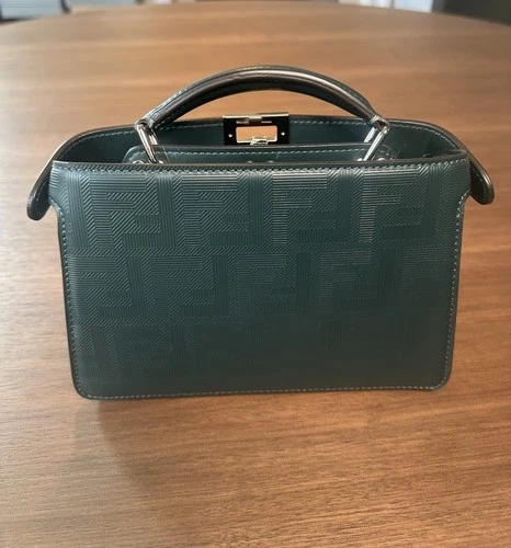 76Iconic Peekaboo ISeeU XCross bag made of dark-green Fendi Shadow leather with a striped texture FF motif, part of the collection curated with designer Stefano Pilati. The interior is organized into two compartments divided by a stiff partition, the front features the iconic twist lock, and there is a zipper closure on the back. Features a tone on tone leather lining, two compartments separated by a stiff partition, a card slot and palladium-finish metalware. Can be carried by hand or on the shoulder thanks to the handle and adjustable, detachable shoulder strap in webbing with FENDI lettering. Made in Italy Measurements: - Height : 14.5 cm - Depth : 6 cm - Width : 23 cm - Weight : 0.44 kg Composition: 100% calf leather, inside: 100% calf leather, 90% polyester, 10% polyurethane (Some photos includes staging with a full look, separate items will be listed in my closet.)