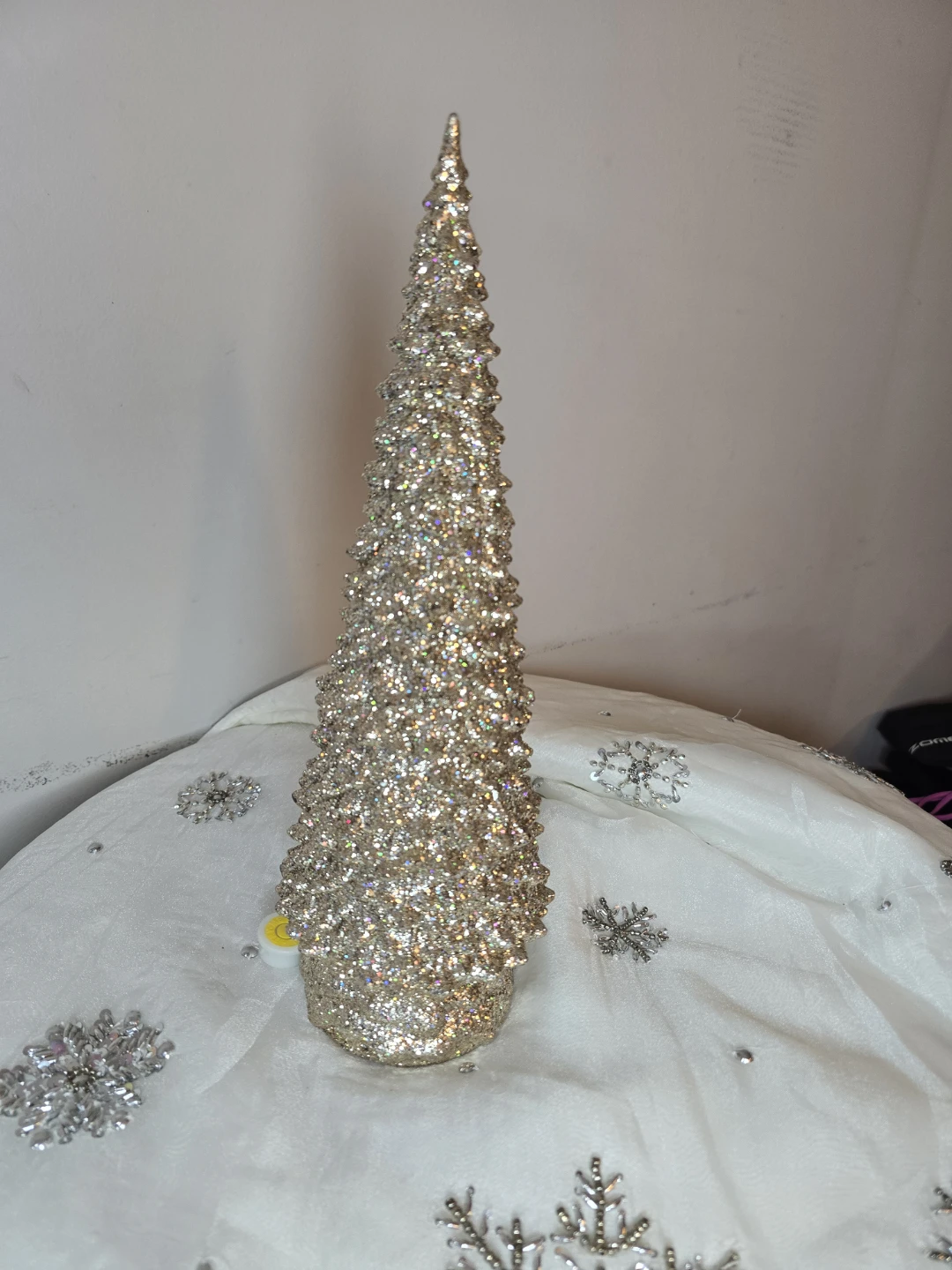 Here's a sparkly Christmas tree decoration! It's perfect for adding a touch of festive cheer to any room. It has a beautiful, glittery finish that catches the light and makes it really stand out.