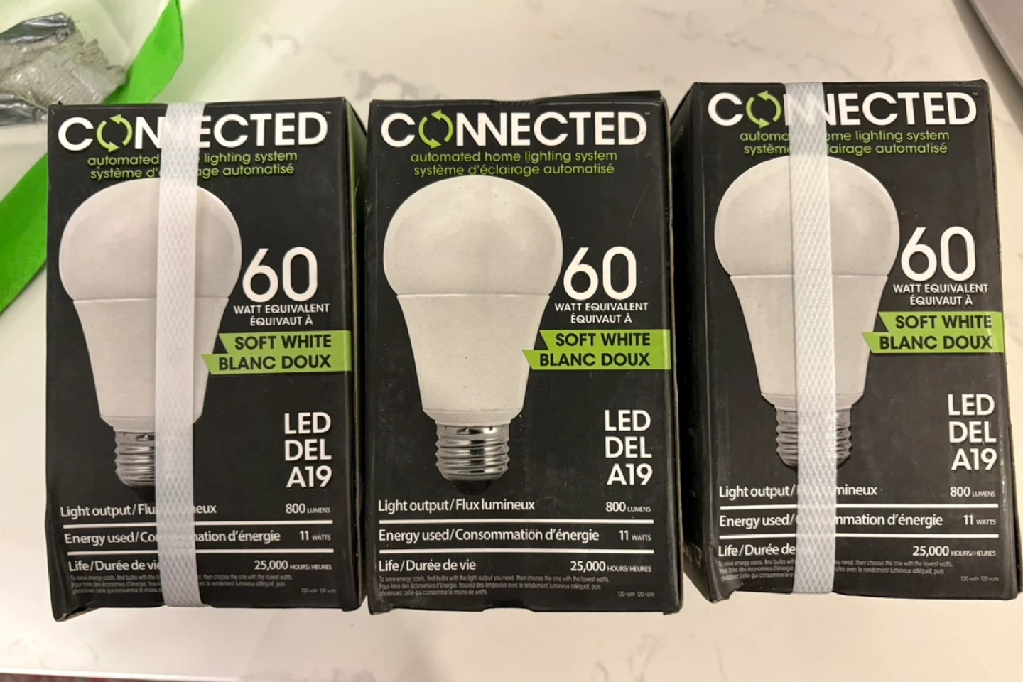 I'm selling a set of Connected 60W equivalent soft white LED A19 light bulbs. They are brand new and in their original packaging. These bulbs output 800 lumens and use 11 watts of energy, with a life of 25,000 hours