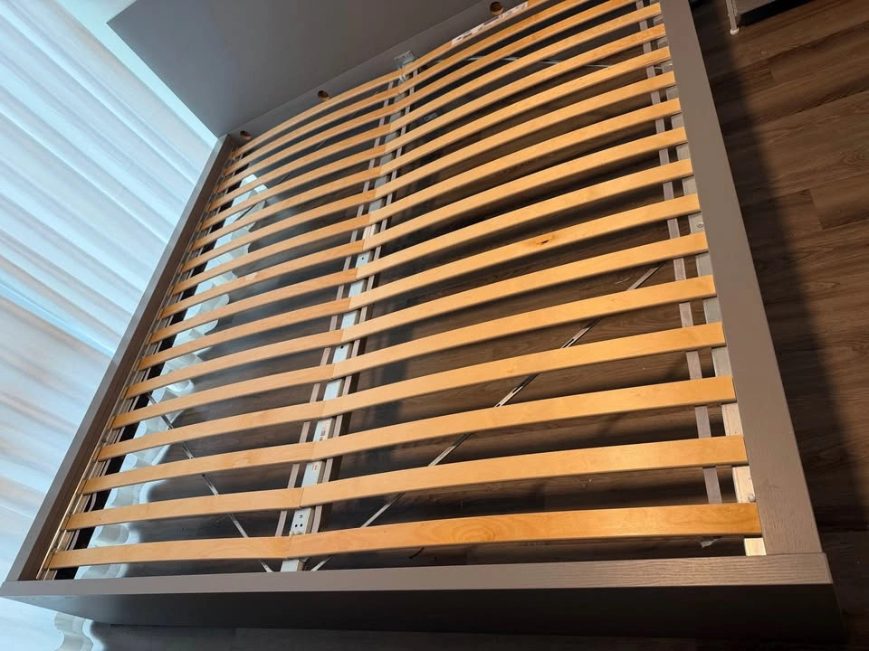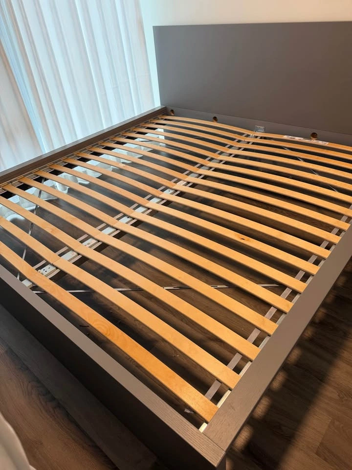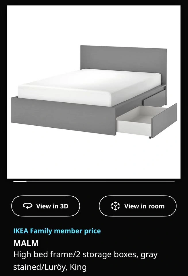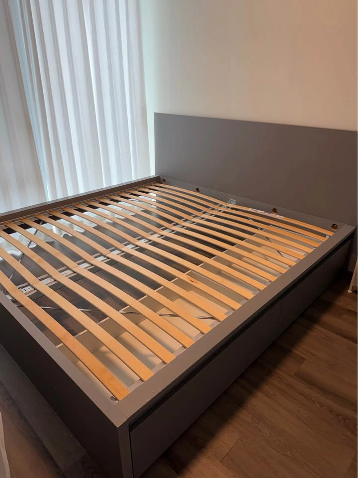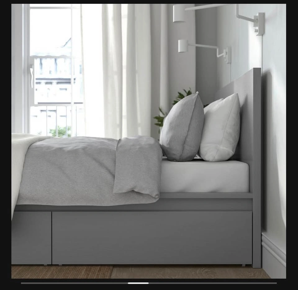 Selling a King-size IKEA MALM high bed frame in gray stained finish, complete with 2 large under-bed storage drawers and Luröy slatted bed base.